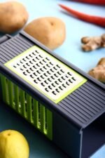 Material: Long-lasting plastic and stainless steel that is rust-proof, making the grater hygienic and safe for your food. 4 in 1 Slicer Grater ABS unbreakable plastic body Stainless Steel Blades Handle for Good Grip.