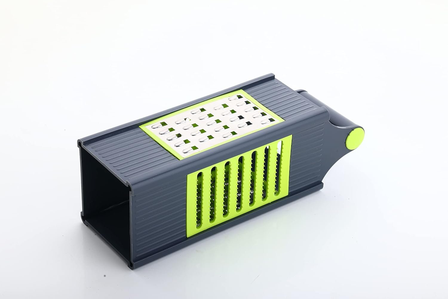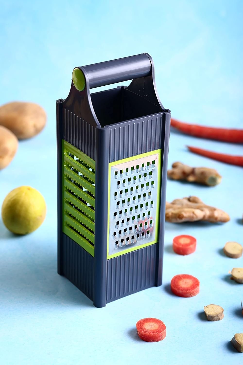 Material: Long-lasting plastic and stainless steel that is rust-proof, making the grater hygienic and safe for your food. 4 in 1 Slicer Grater ABS unbreakable plastic body Stainless Steel Blades Handle for Good Grip.