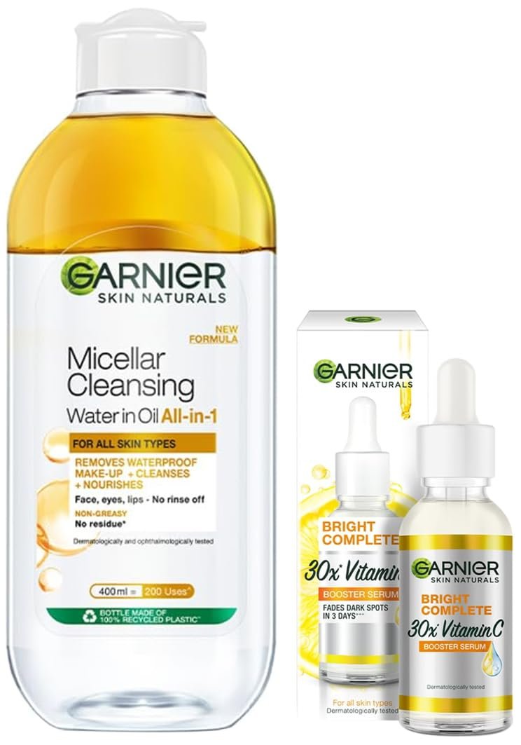 Garnier Bright Complete VITAMIN C Booster Face Serum, 30ml & Garnier Skin Naturals, Micellar Oil-Infused Cleansing Water, 400ml