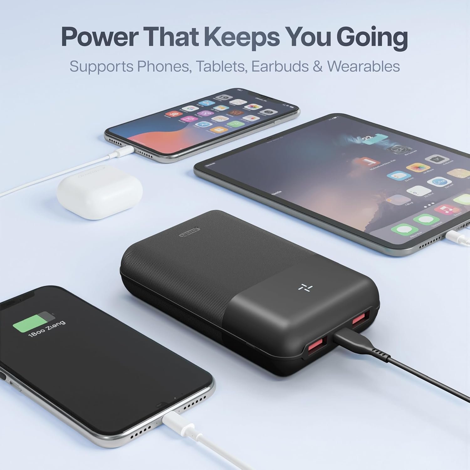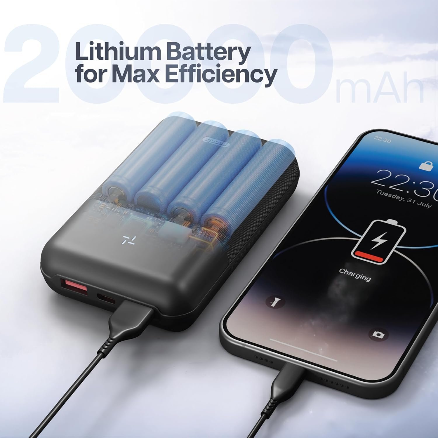 Massive 20000mAh Battery Capacity – Stay powered longer with a high-capacity 20000mAh power bank, perfect for charging smartphones, tablets, and more multiple times.