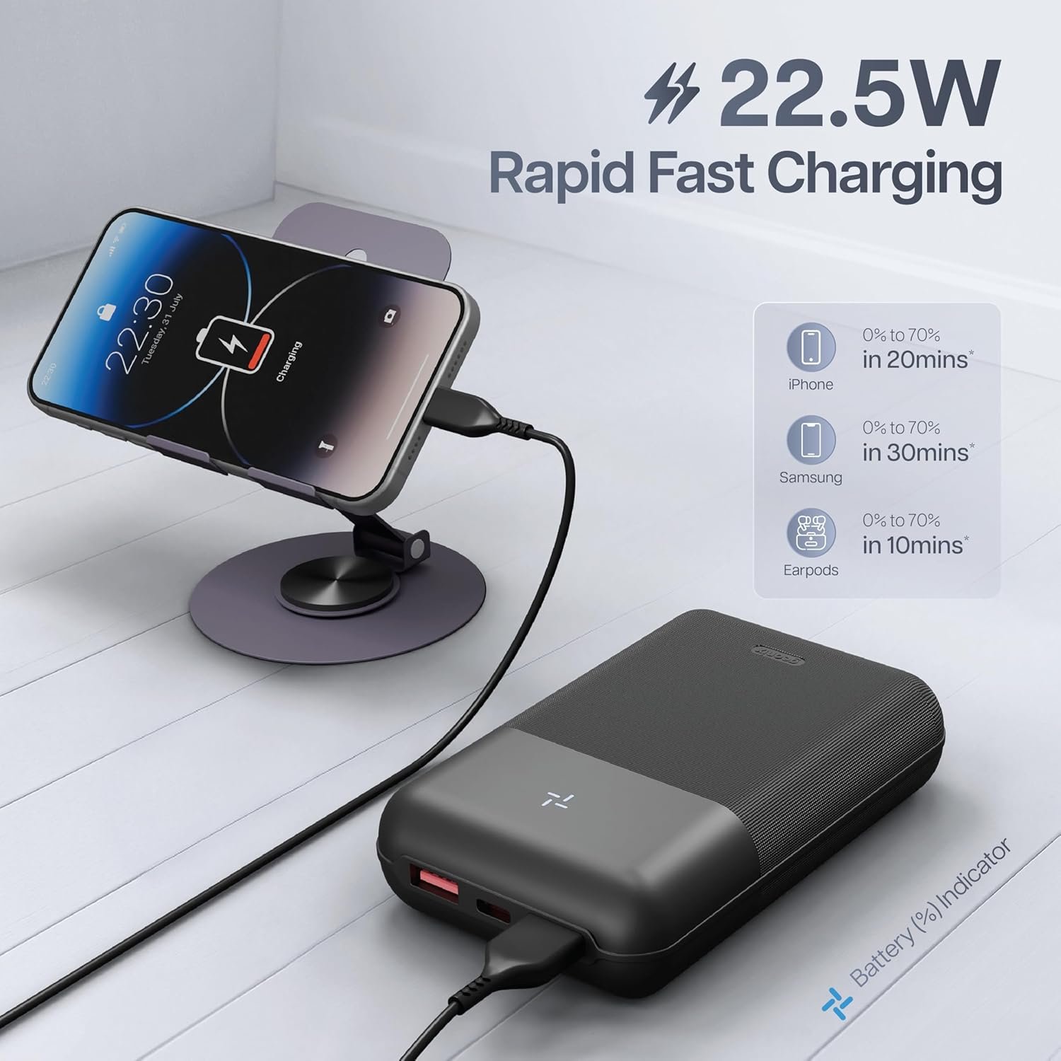 22.5W Super Fast Charging Support – Equipped with high-speed charging technology to quickly charge your devices via USB-A and Type-C ports.