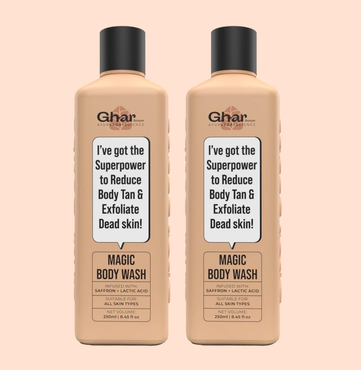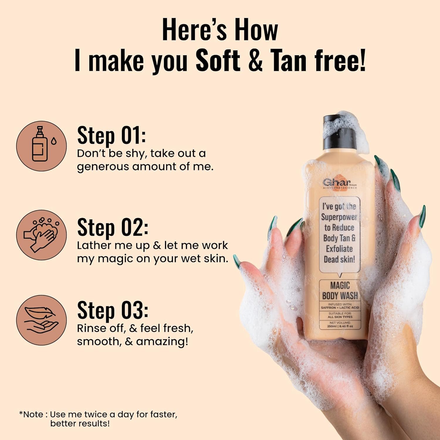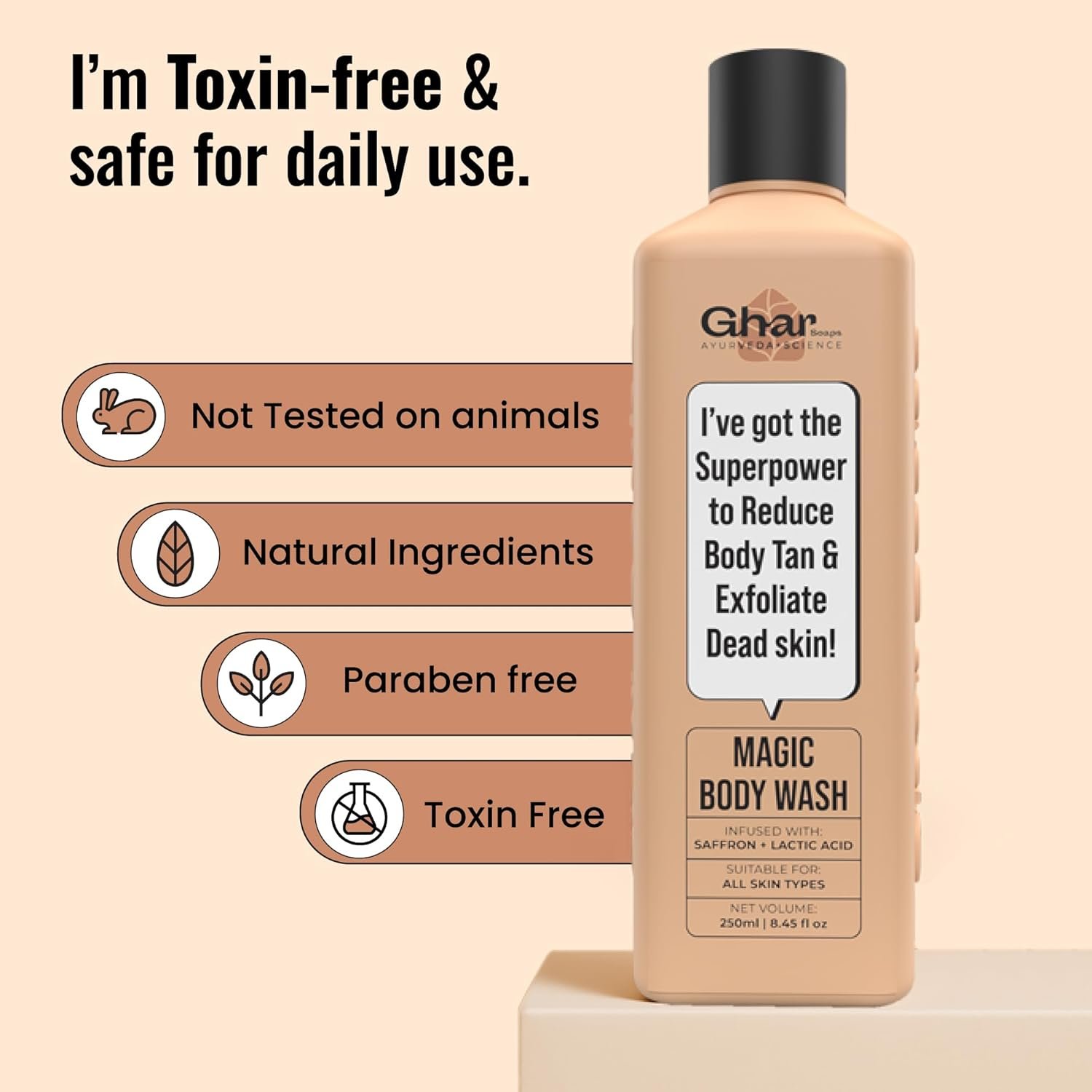 Ghar Soaps Magic De-Tan body wash for tan removal | Exfoliating Body Wash with Saffron, Lactic Acid & Niacinamide | Detan body wash | Removes Tan & Evens Skin Tone | Paraben & SLS Free