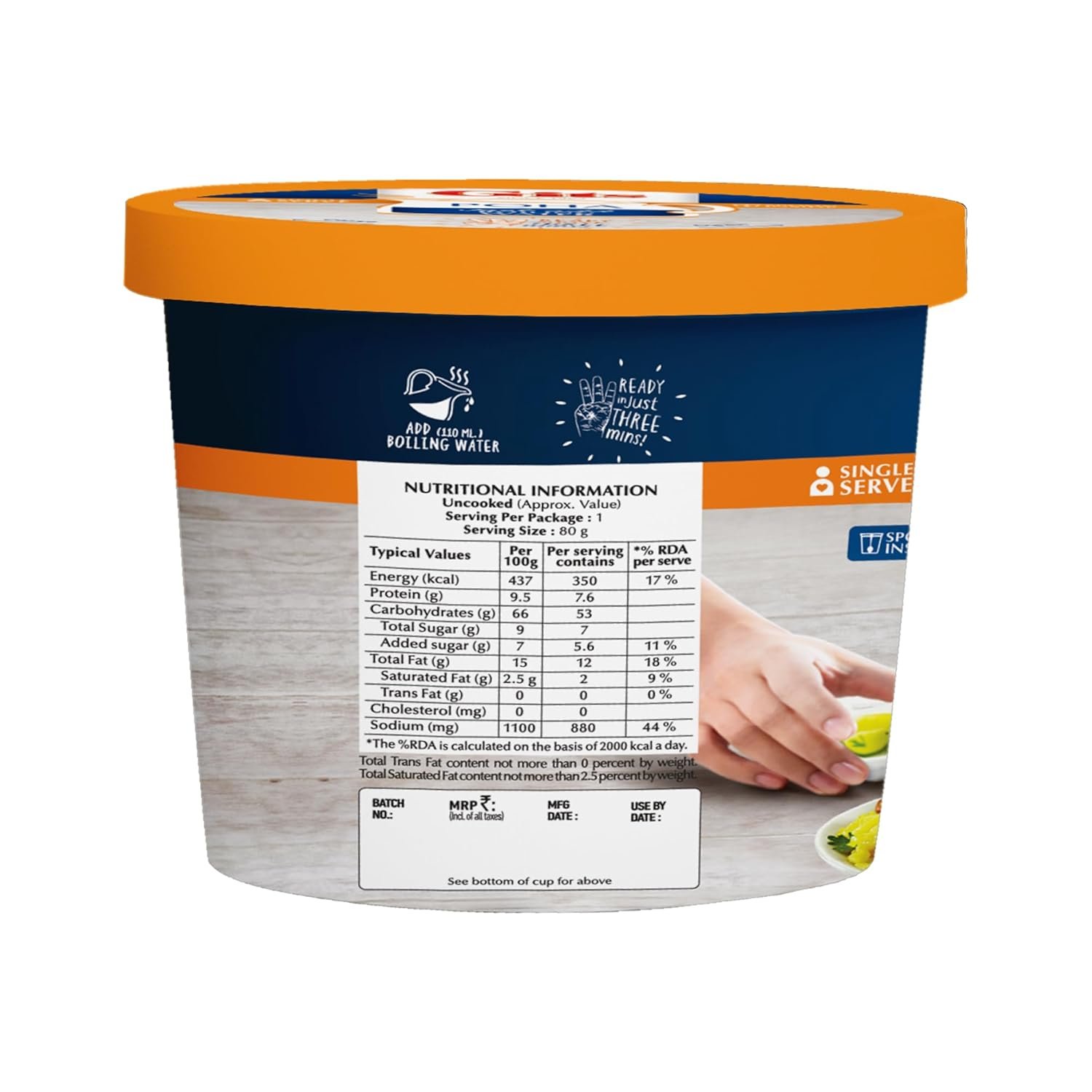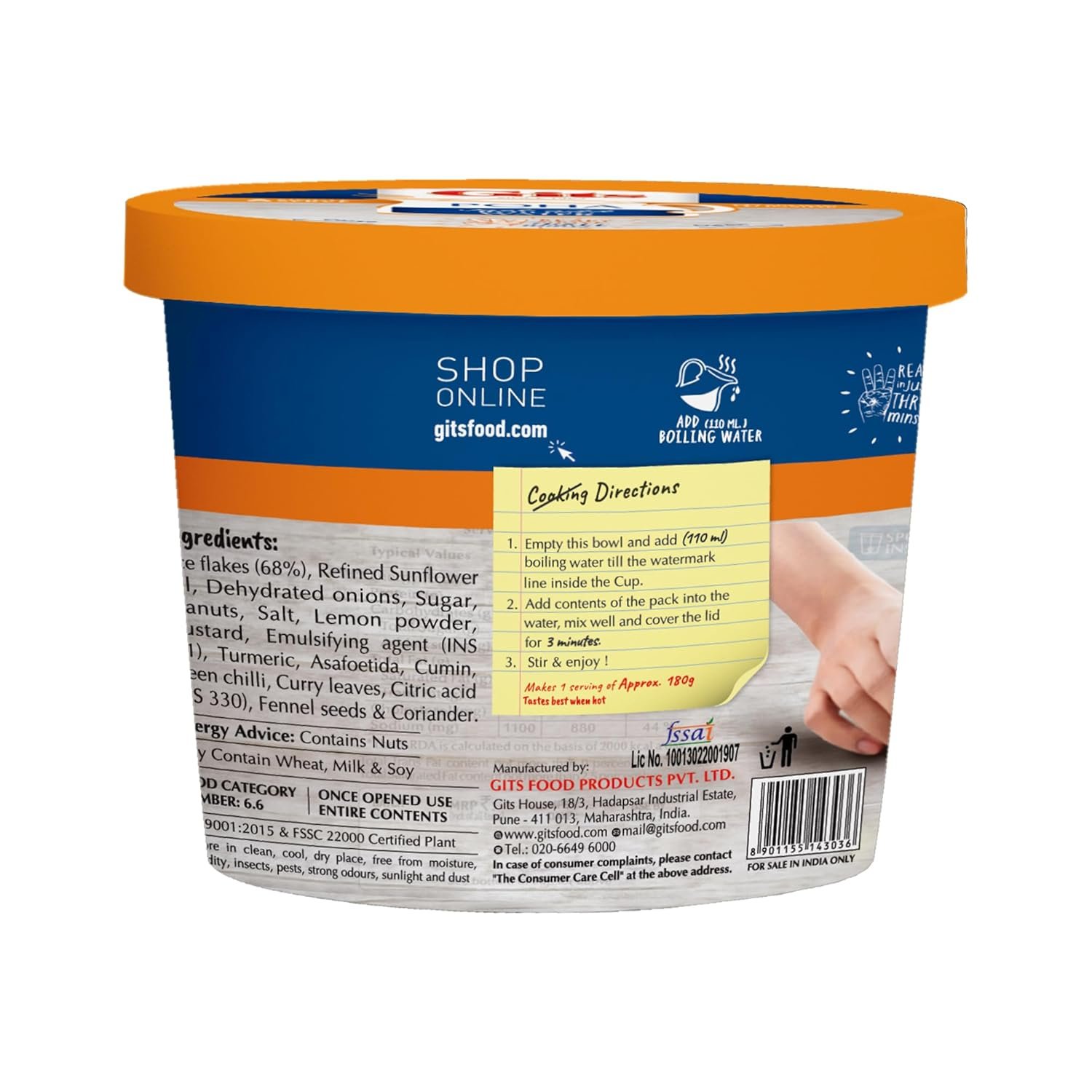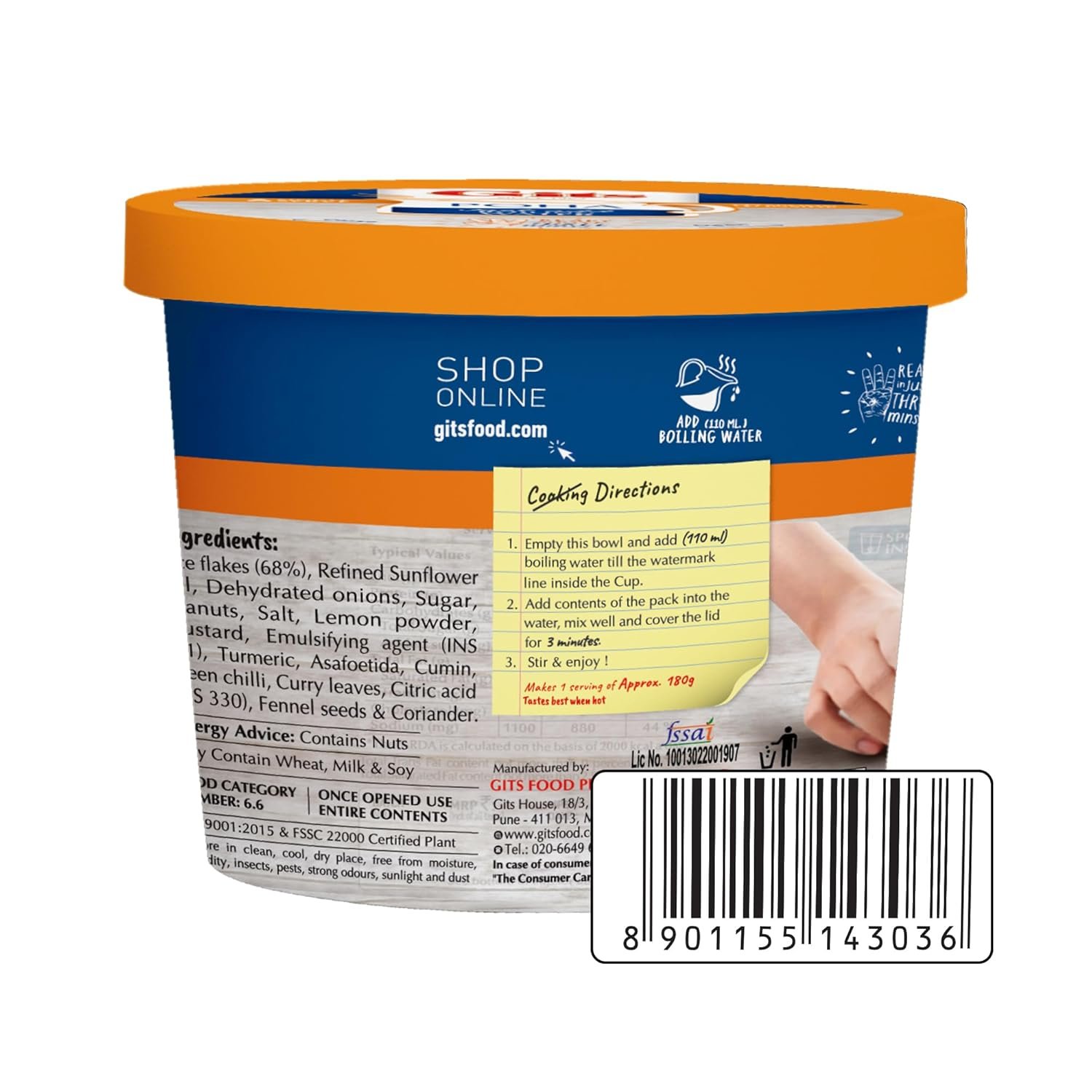 A quick Indian breakfast with flattened rice, onions, spices and lemon juice. Just add hot boiling water, and the Gits Poha cup is ready in 3 minutes.