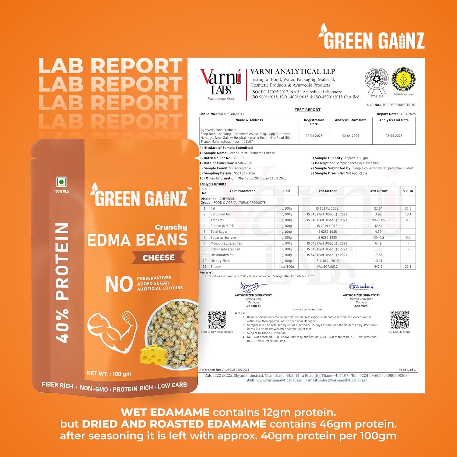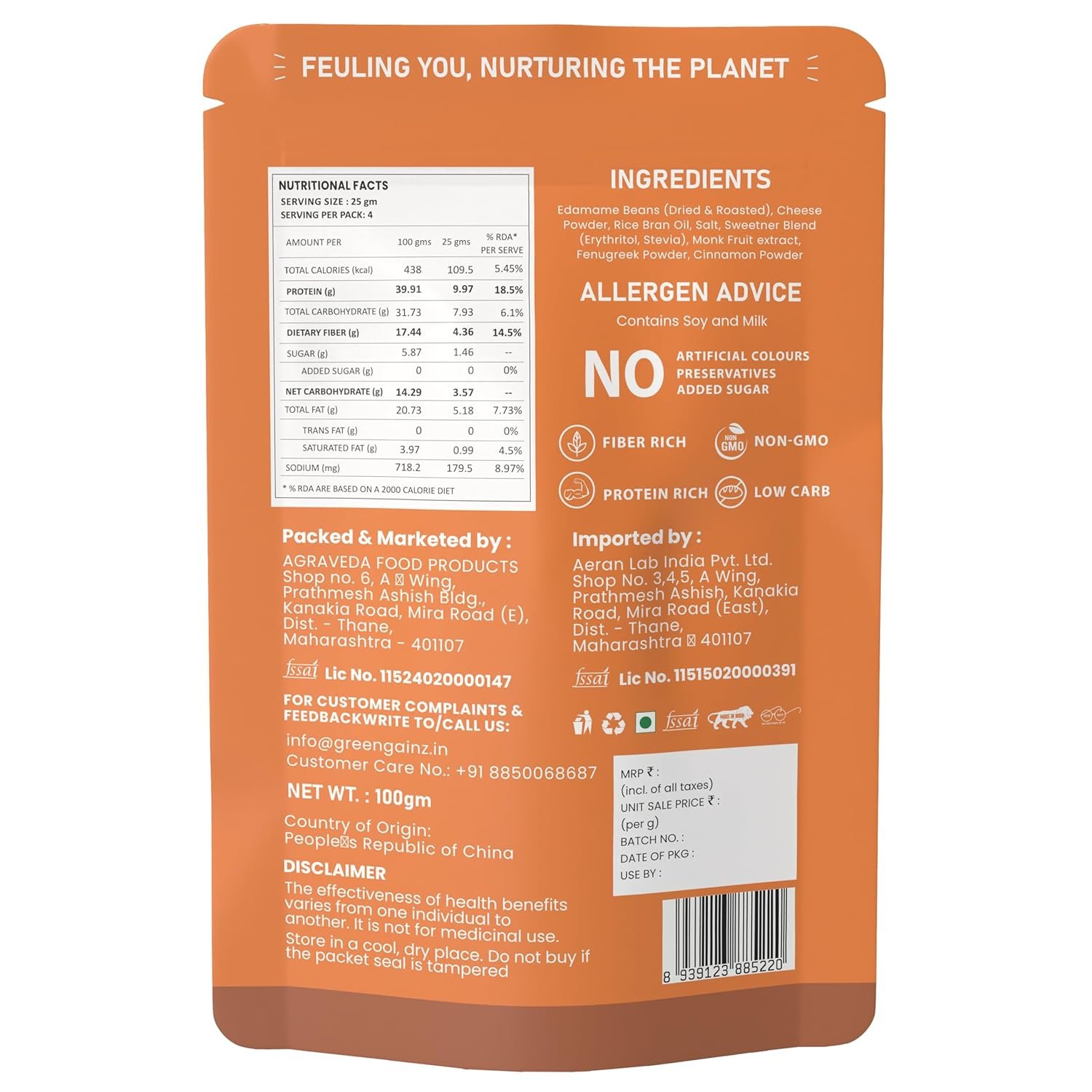 100% Veg High Protein Snack – Green Gainz Roasted Edamame Beans – Cheese Flavor delivers 10g of plant-based protein per serving. This cheesy snack supports muscle health, energy, and fullness, perfect for gym-goers, athletes, and health-conscious individuals keeping carbs low.