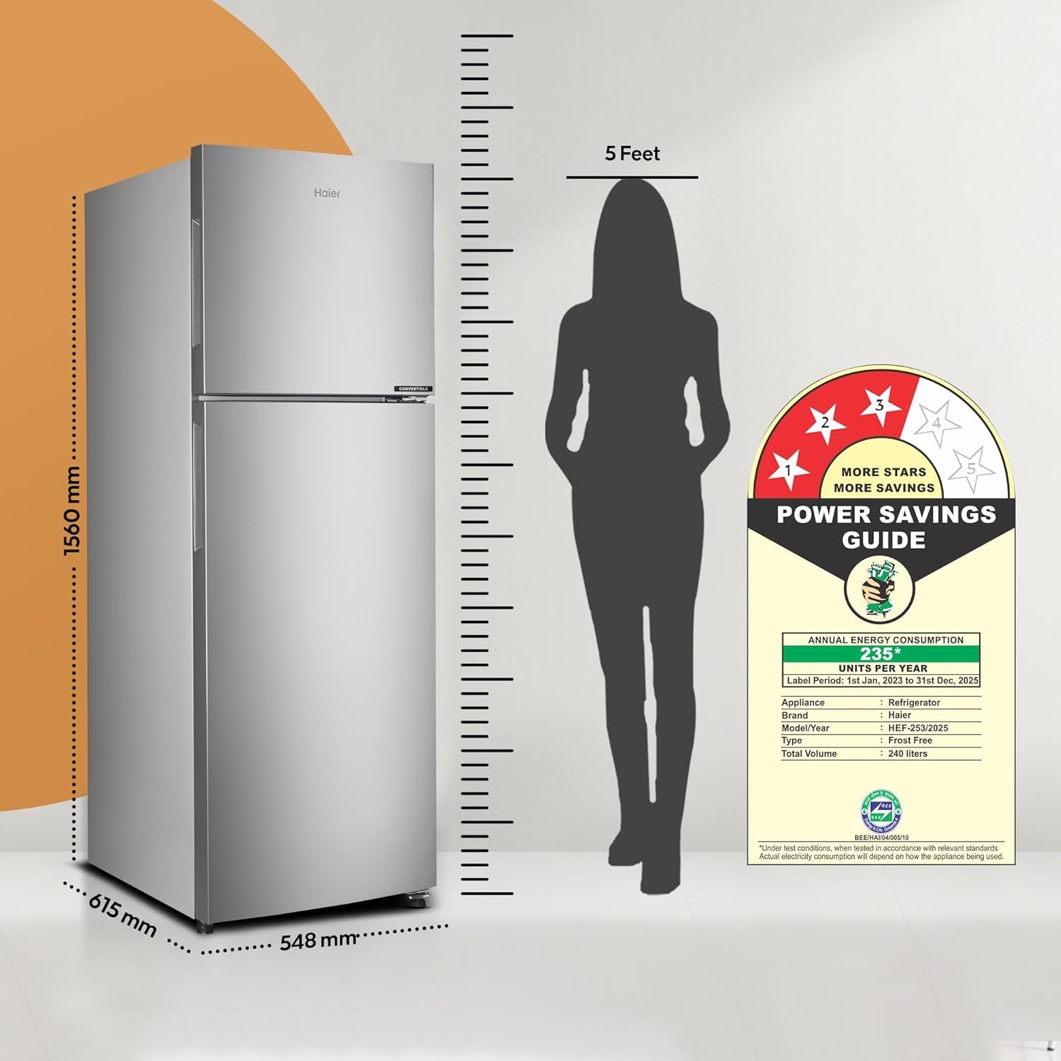 8 reviews for Haier 240L 3 Star Frost Free Top Mount Double Door Refrigerator|5 In 1 Convertible Modes|Twin Inverter|200% Faster Ice Making in 49 Minutes (HEF-253GS-P, Moon Silver)
