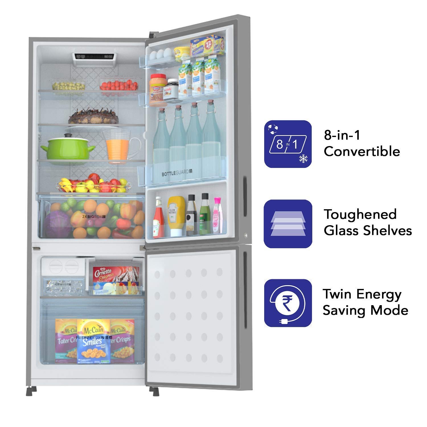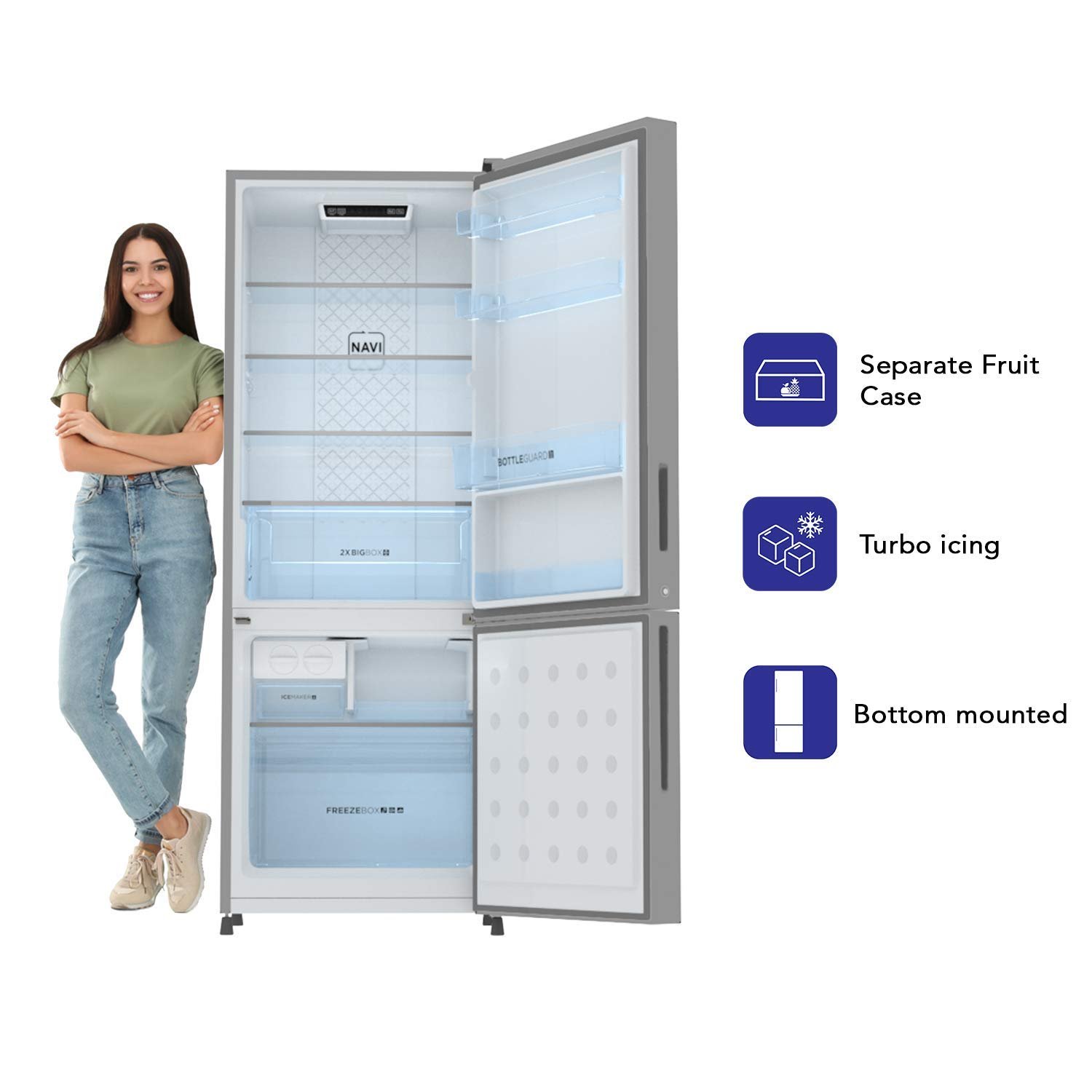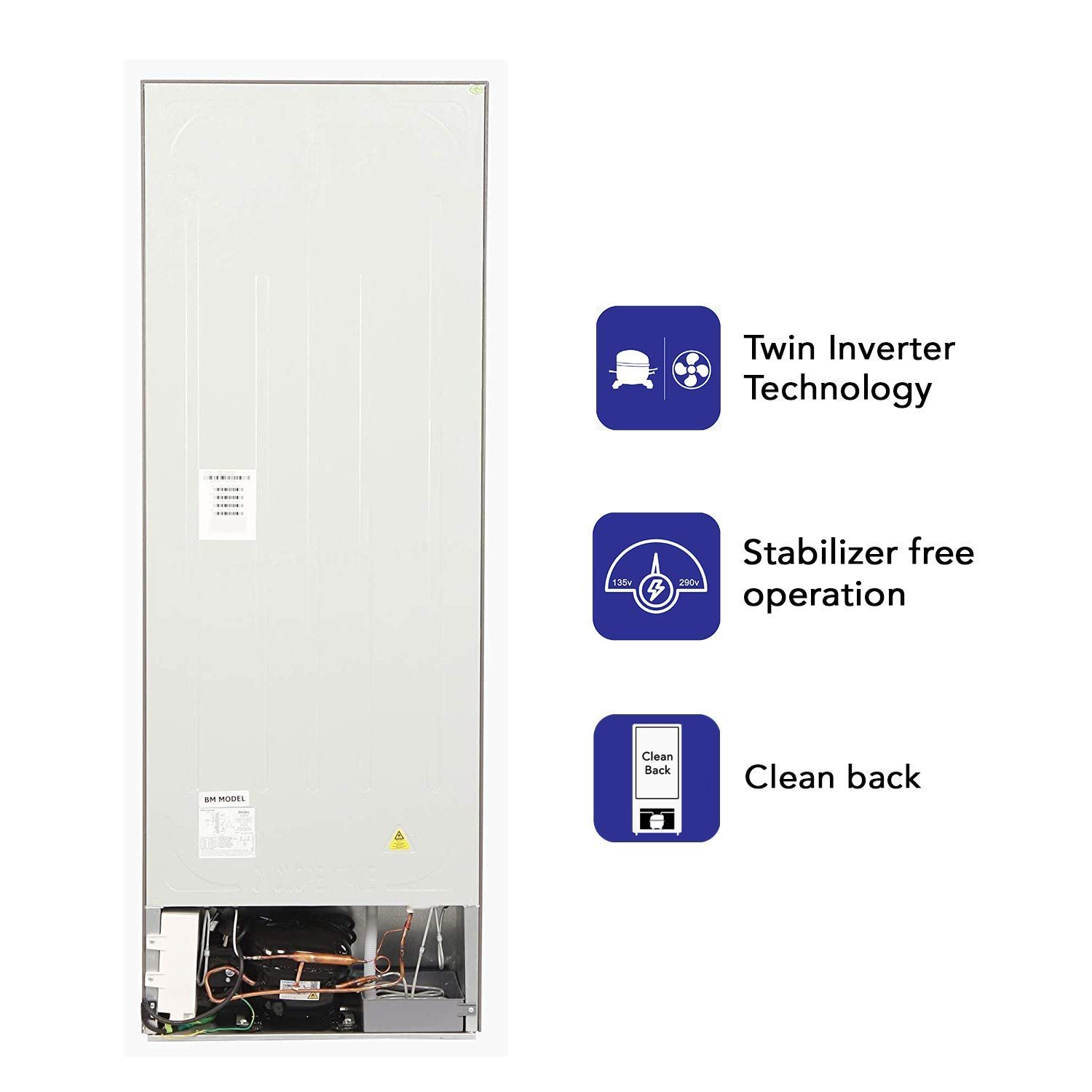 This new Bottom Mounted Refrigerator by Haier comes with a 10 years of warrany on compressor & Fan Motor. This refrigerator is with 8-IN-1 Convertible Mode, Twin Inverter Technology , Twin Energy saving mode , Turbo Icing , Recess Handle & a stabilizer free operation with a range of 135-290V that protect the compressor from power fluctuations.