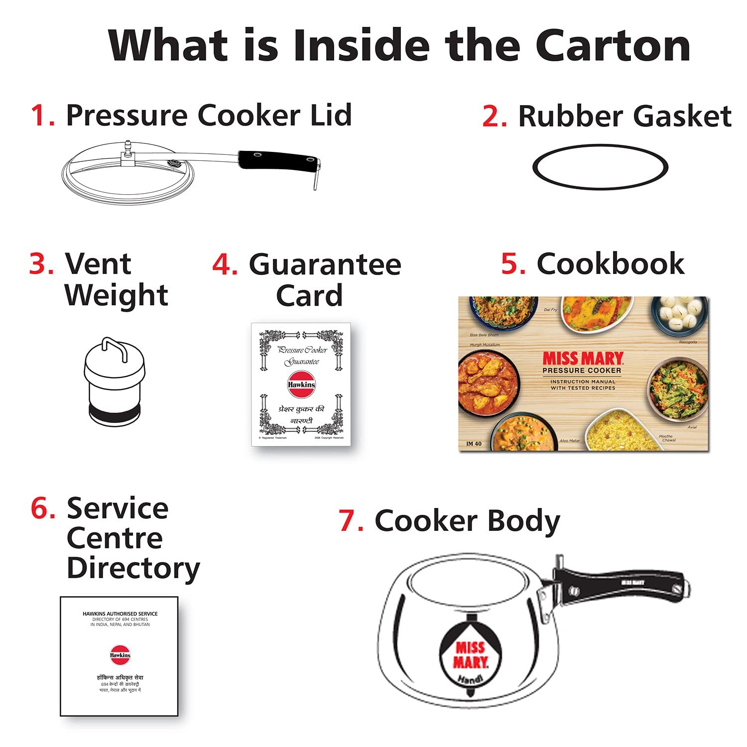 Miss Mary Handi pressure cooker features a Curved Body for easy stirring, easy removal of food, better visibility of food. It has a 3.25 mm thick metal base which is stronger, safer, hygienic. Each Miss Mary cooker is tested to be leak-proof. It has an improved vent weight (Whistle) which is more efficient, causes less dal sprouting, cooks faster and saves fuel. Each Miss Mary Handi features an inside-fitting lid. This design is inherently safer than conventional cookers. Thus it is pressure-locked for safety – like a jetliner door! The safety valve is located under the lid handle bar so that when it operates the steam is safely deflected downwards. The gasket has minimum exposure to steam inside the cooker, does not rub every time the product is opened and closed – so lasts longer. Stay-cool handles. Fixed sturdy pivot does not put pressure on the plastic handles as it is a part of the metal handle itself. Thus handles last longer. Recommended for use on gas stoves.