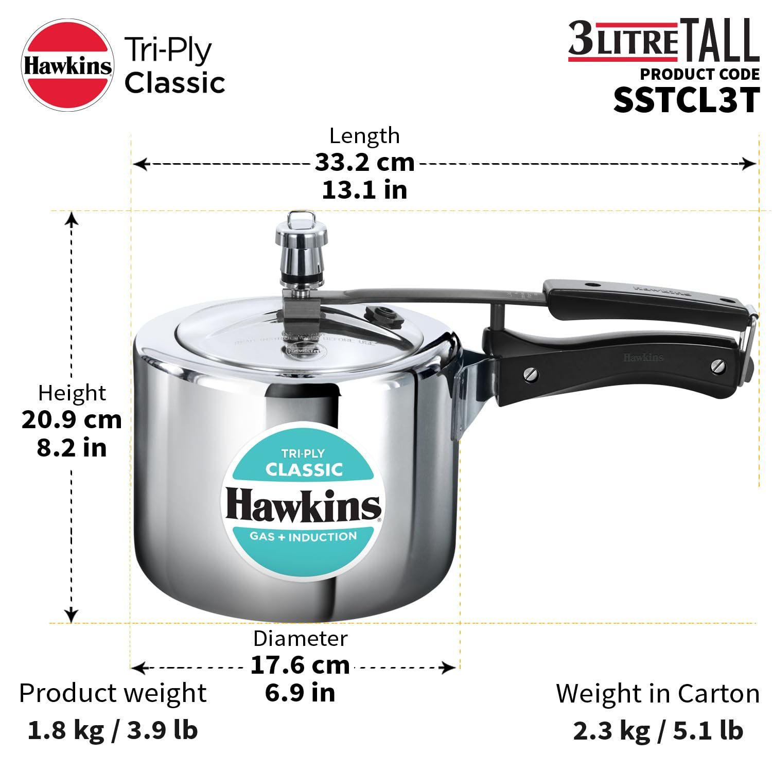 Hawkins Triply 3 Litre Classic Pressure Cooker, Triply Stainless Steel Induction Inner Lid & Tall Design Cooker, Silver (SSTCL3T)