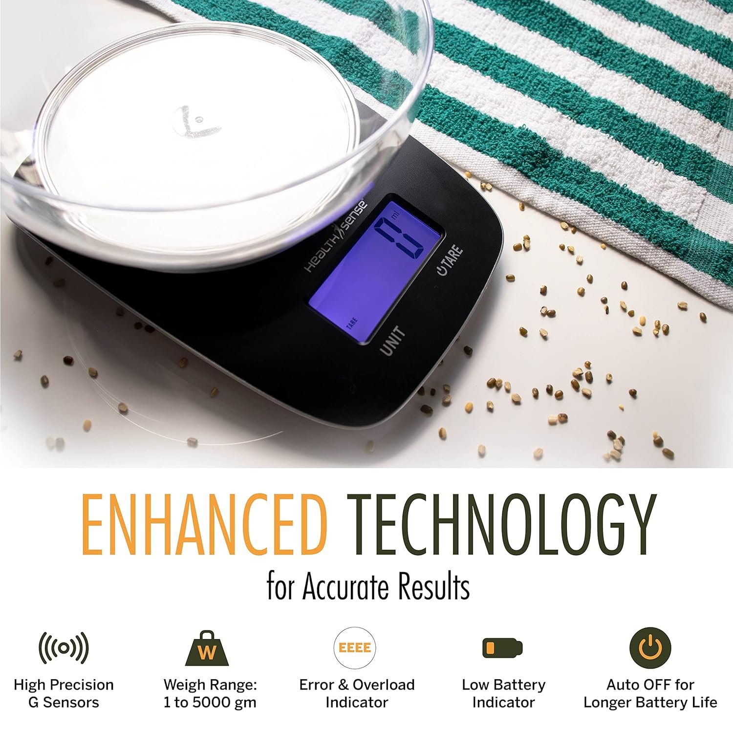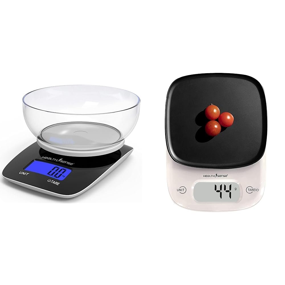 HealthSense Chef-Mate KS33 Digital Kitchen Scale | Weighing Machine with Bowl | Home, Fitness, Cooking | 1-Year Warranty & Batteries | & HealthSense KS63 Scale with LCD, Tare, Touch