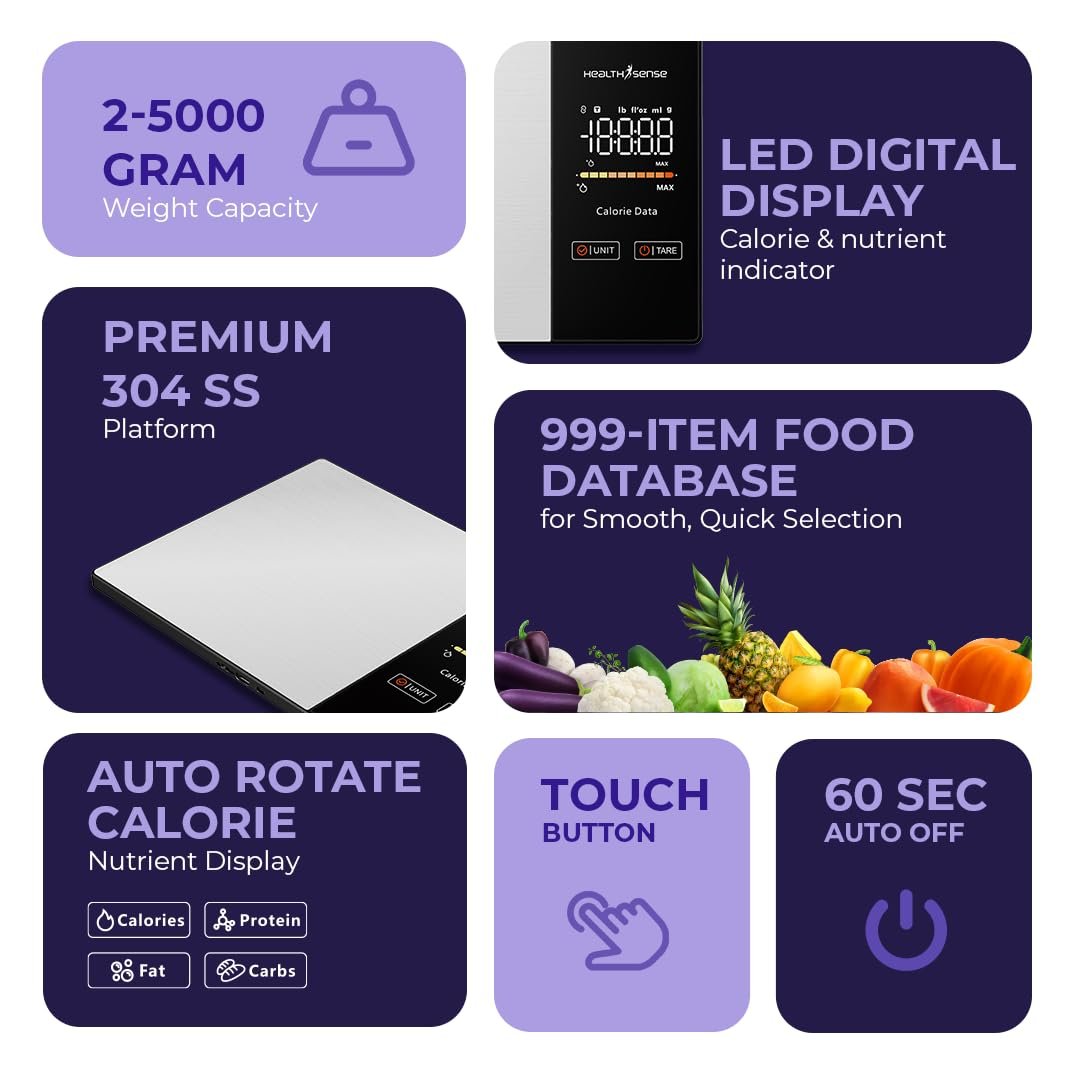 HealthSense Smart Kitchen Weighing Machine for Food|Digital Weight Scale for Home with Nutritional Calculator App 24 Nutrients LED Display Tare Function Stainless Steel Platform |1Year Warranty(KS100)