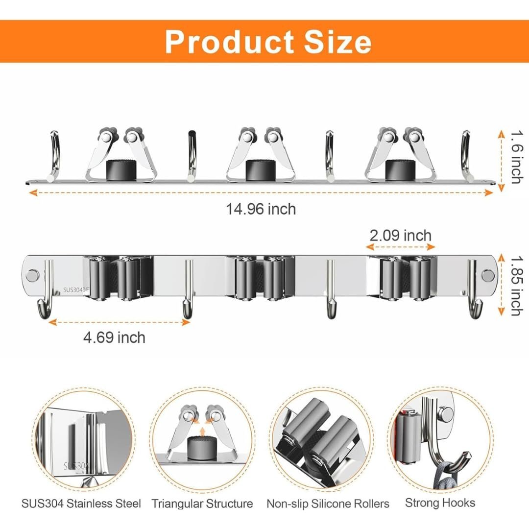 𝗛𝗘𝗔𝗩𝗬 𝗗𝗨𝗧𝗬 𝗖𝗢𝗡𝗦𝗧𝗥𝗨𝗖𝗧𝗜𝗢𝗡: Crafted from stainless steel, this mop holder and broom holder is designed for durability. Its heavy-duty construction supports a variety of cleaning tools, making it a reliable broomstick holder wall mounted for daily use.