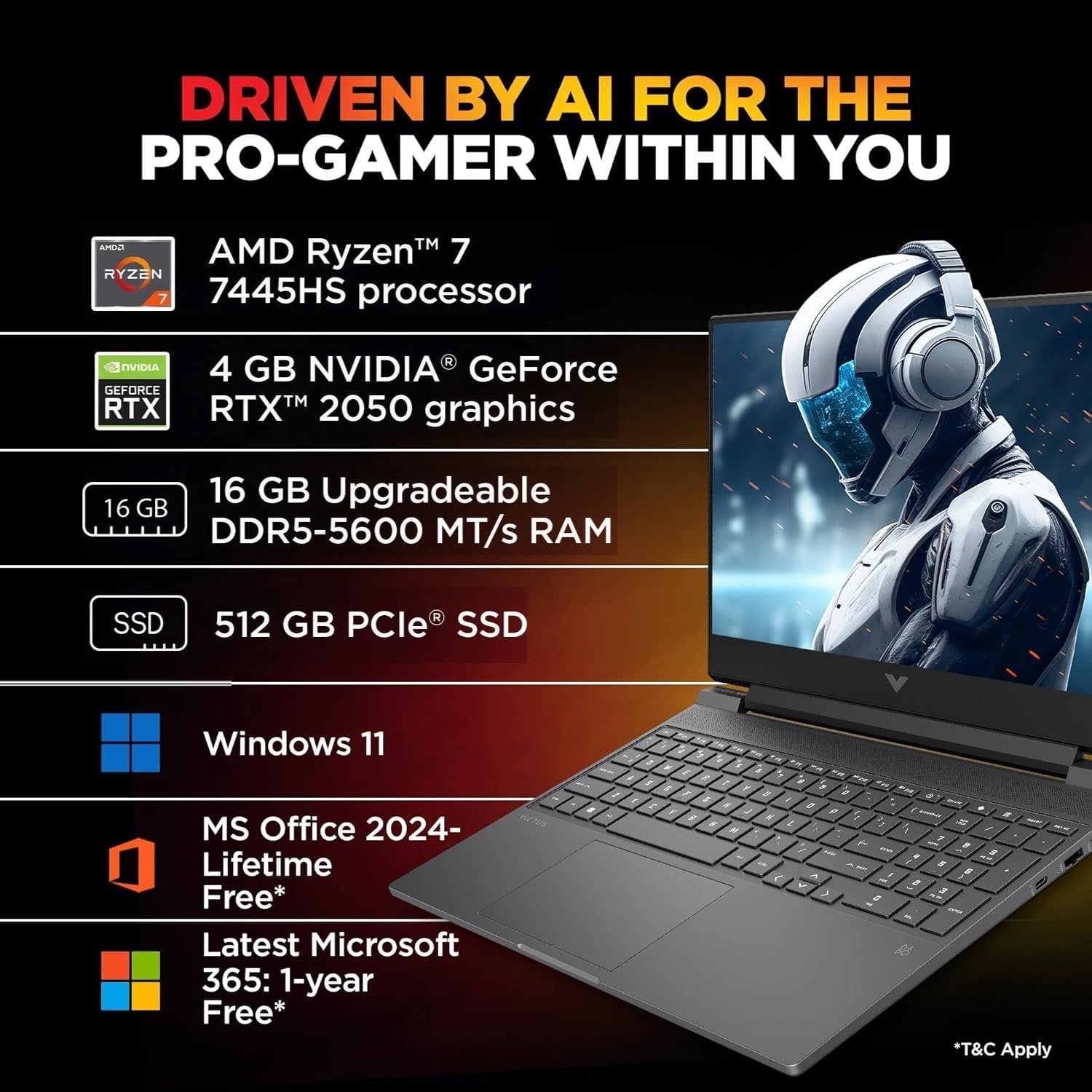 HP Victus, AMD Ryzen 7 7445HS, 4GB RTX 2050, 16GB DDR5(Upgradable) 512GB SSD, FHD, 144Hz, 300 nits, IPS, 15.6”/39.6cm, Win11, M365* Office24, Mica Silver, 2.29kg, fb3123AX, Backlit, Gaming Laptop