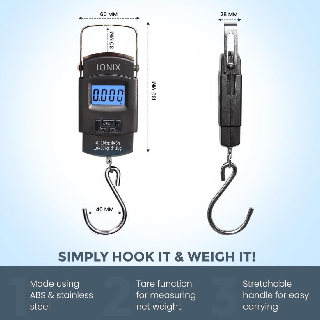 IONIX Weight Machine for Luggage, Wait Machine, Luggage Wighing Scale, Digital Weighing Scale, Bag Weighing Scale for Luggage, Electronic Portable Fishing Hook Type Digital LED Screen, 50 kg (Black)