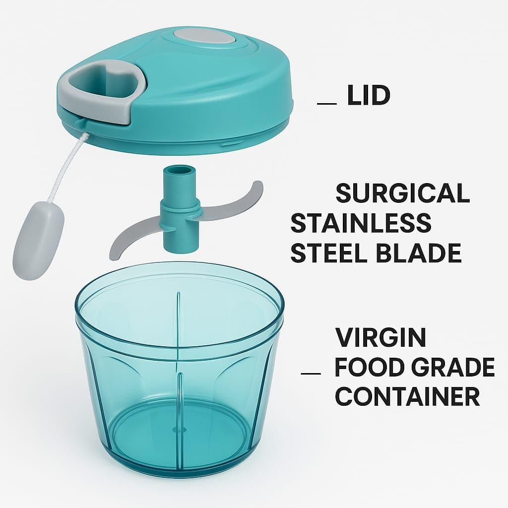 JTG Chopper is Ideal for chopping and cutting onion, vegetables, dry fruits, nuts, herbs, etc. It has Sturdy Stainless Steel Blades for quick and efficient chopping. It provide Tear Free Chopping for Onions, Garlic, Chilly, Etc. Make it instant-Paste, Chopping, Gravy, Salad, Chutney, Food Preparations, etc. using this Chopper. Easy to Clean and Disassemble. Wonder Chopper is made From Food grade BPA free Virgin Material. No Electricity required. Four Safe lid locks ensures Safety during use. It has Non-skid base. It gives about More Than 380 Knife Cuts in less than 20 Sec. It Cuts and Chops with easy hand pull Cord function.Use and Care : Take the Chopper Container and Fix blade holder in the Centre. Cut the ingredient in to appropriate size and add evenly around the blade. Don’t Fill the bowl more than 3/4 of bowl Capacity. Close the Container with Chopper lid and Make Sure it is locked Securely. Pull handle Parallel to bowl. Sharp blades handle with Care. Keep out of the reach of Children.