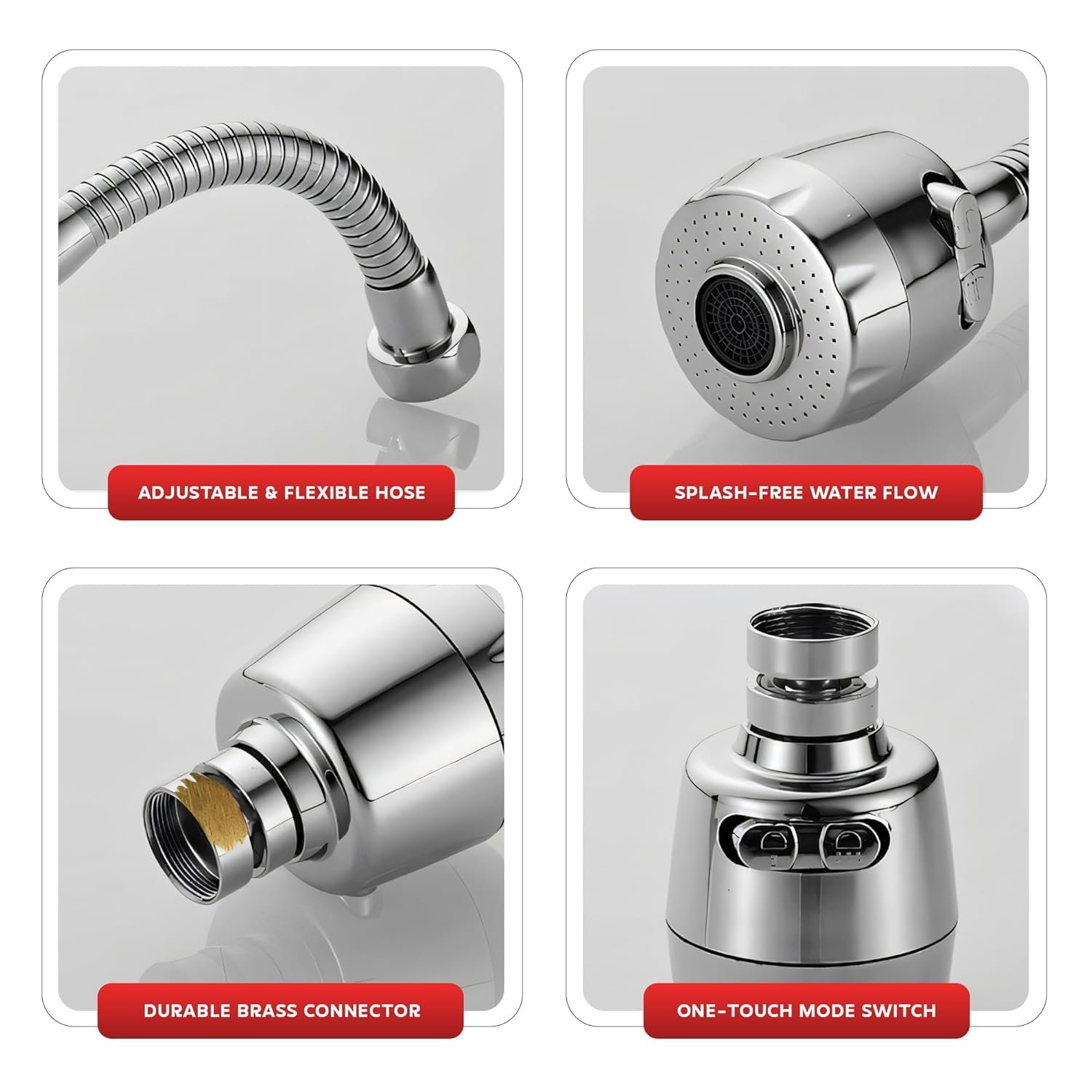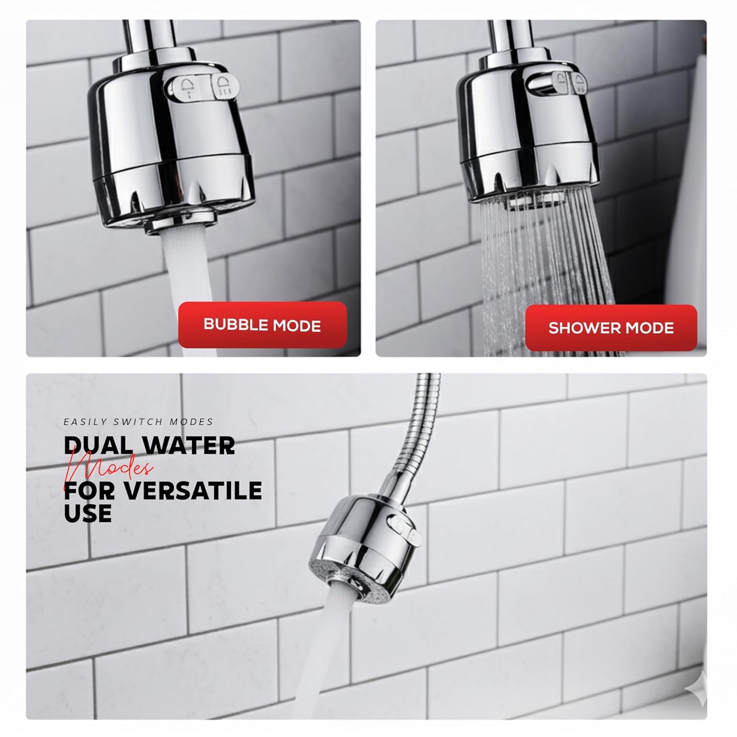 This tap extender has one great advantage over others available in the market, the flexible pipe that you can rotate almost 360 degrees to ensure water flow can be directed anywhere you want.The material is sturdy and has good chrome finishing. It took me a little time to realize how to install, you might need to put some thread in the space between the water outlet and the place where the extender connects to ensure no leakage.It is easy to use once you have installed it though. Both modes work properly, but the real advantage is the high pressure mode that has a long reach and gives you the ability to clean tough stains.Been using it over two months and no leakage or wear and tear on the extender. It has been great value for money at the price I bought it for during the sale. 4-4.5 stars for me. The only issue is they should provide clear instructions on how to install.