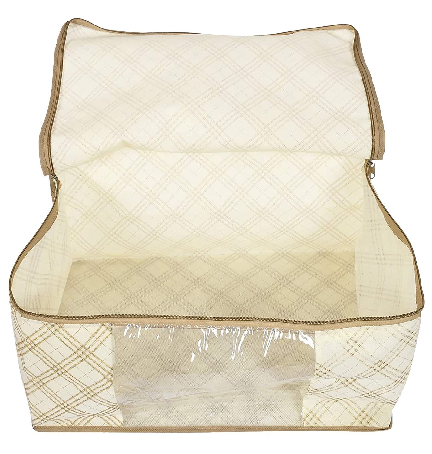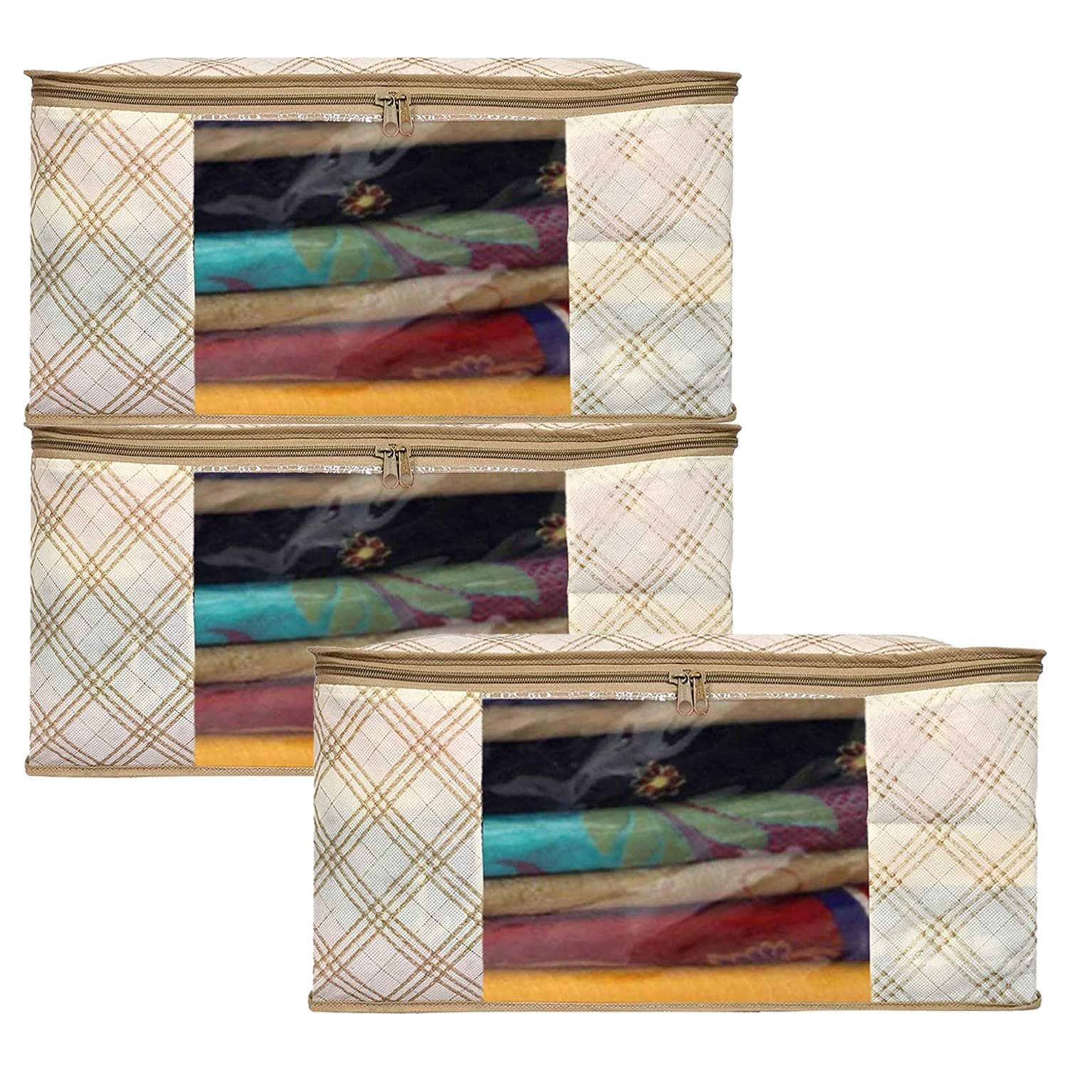 Kuber Industries Non-Woven Checks Print Saree Covers With Zip|Wardrobe Organizer For Clothes|Transparent Window Keep 8 To 10 Saree|Suitable For Lehenga, Suit, Dress|Pack Of 3 (Cream)