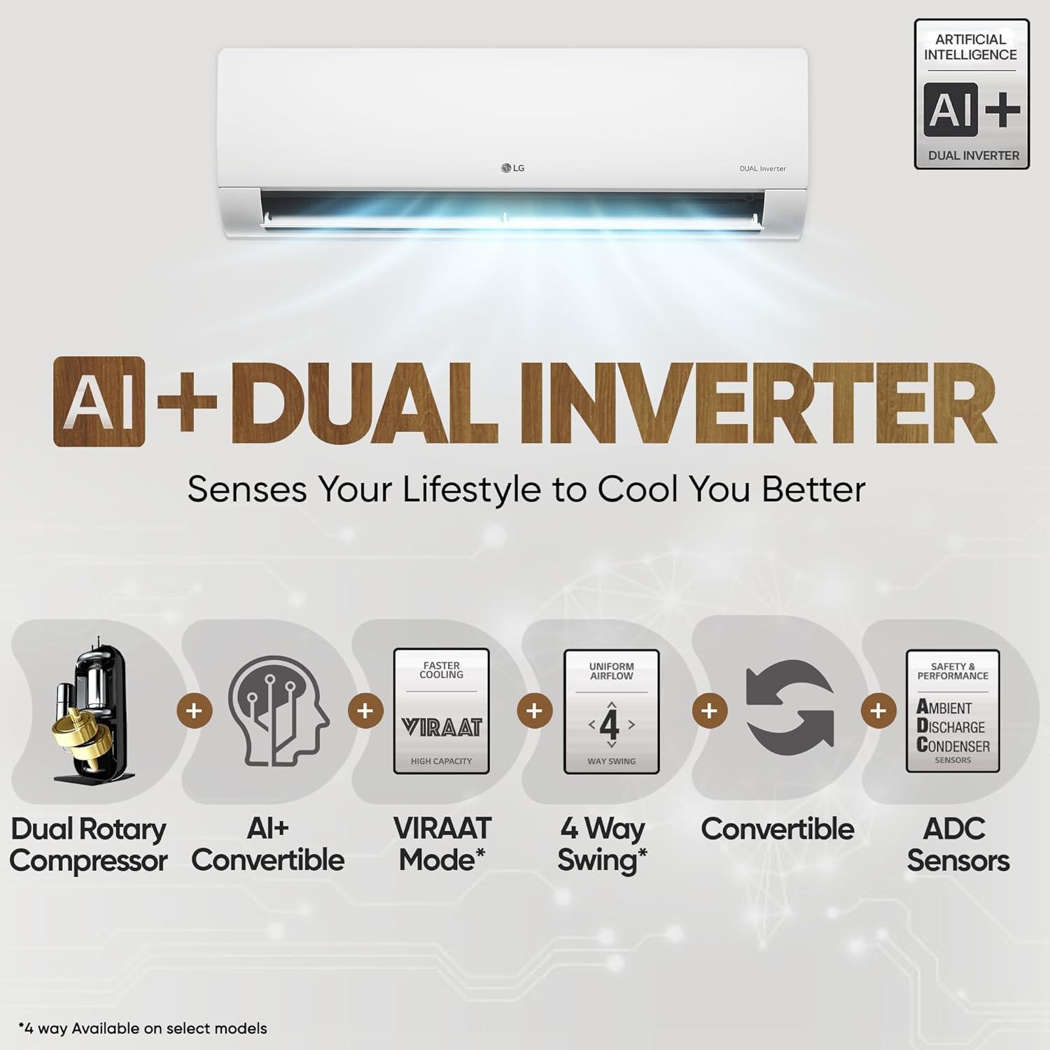 LG 1.5 Ton 5 Star DUAL Inverter Split AC (Copper, AI Convertible 6-in-1, VIRAAT Mode, Faster Cooling & Energy Saving, 4 Way Swing, HD Filter with Anti-Virus Protection, US-Q19YNZE3, White)