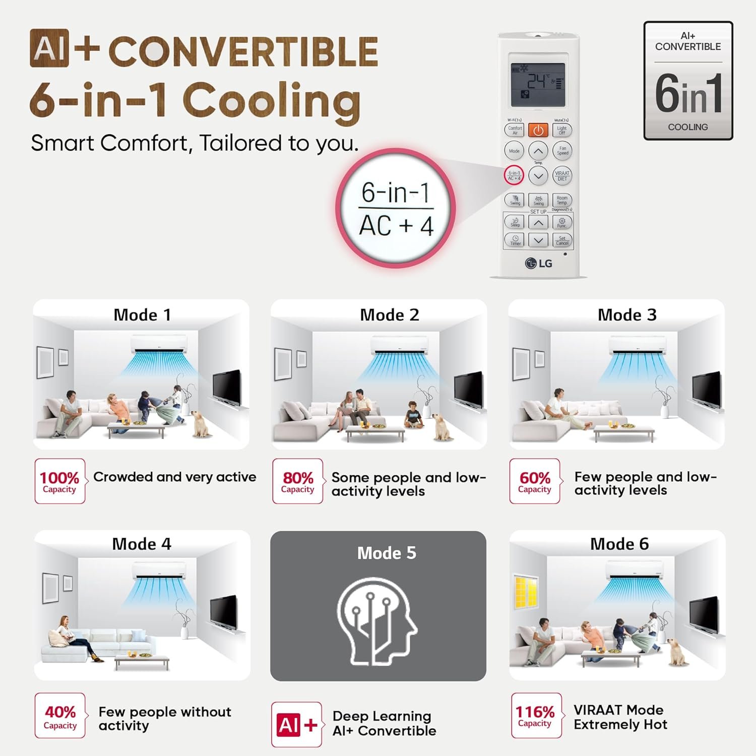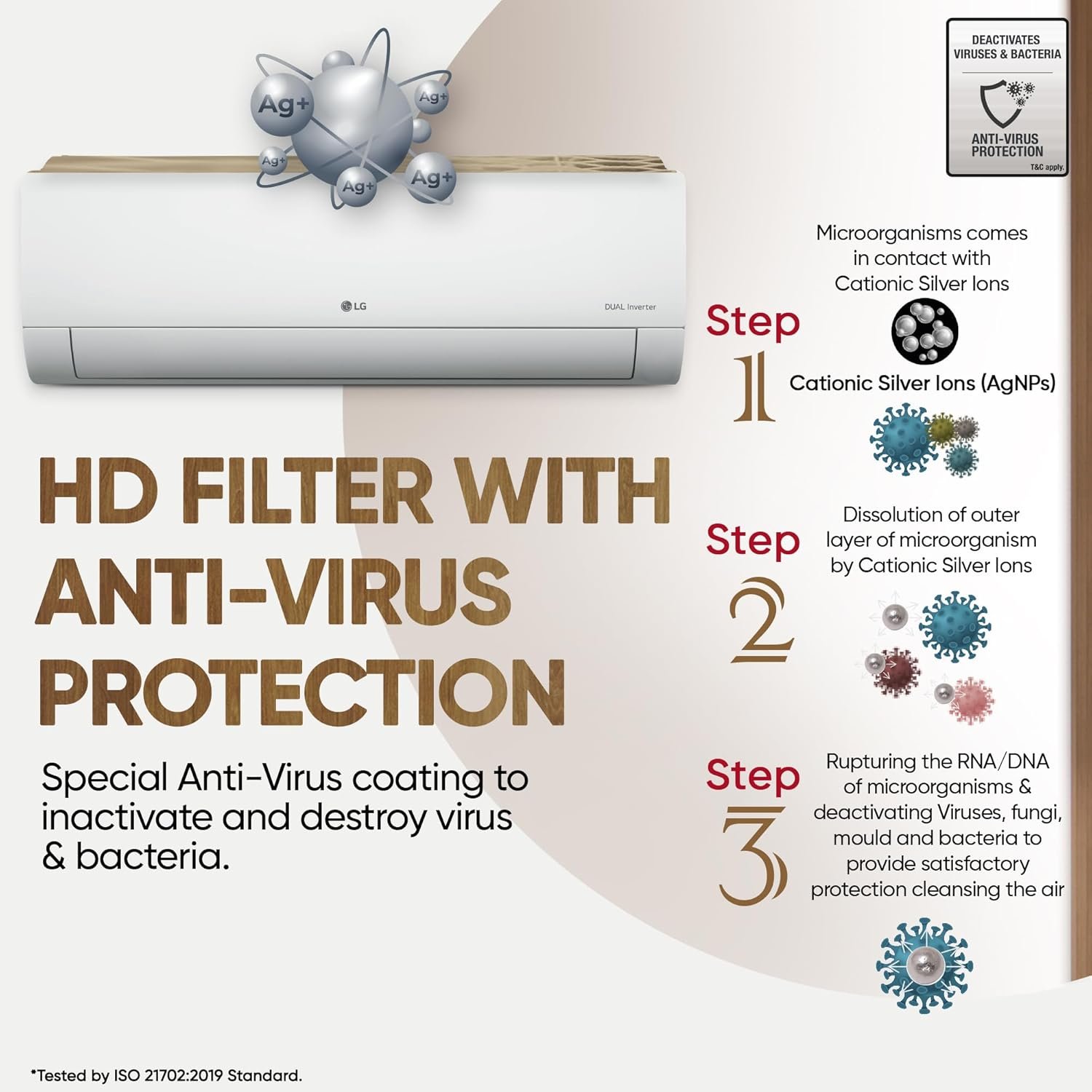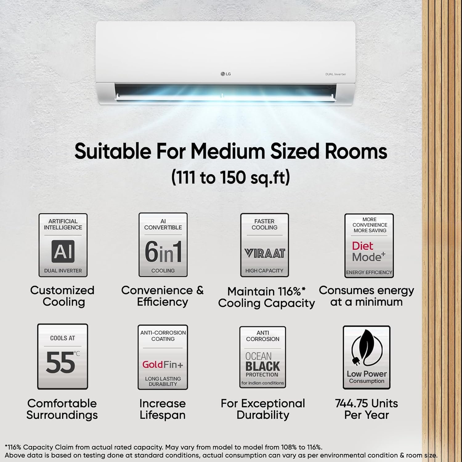 Powerful Cooling with DUAL Inverter Compressor: Experience rapid and consistent cooling with LG’s DUAL Inverter Compressor. This advanced technology ensures the AC cools faster, lasts longer, and runs much quieter than conventional models while maximizing energy efficiency