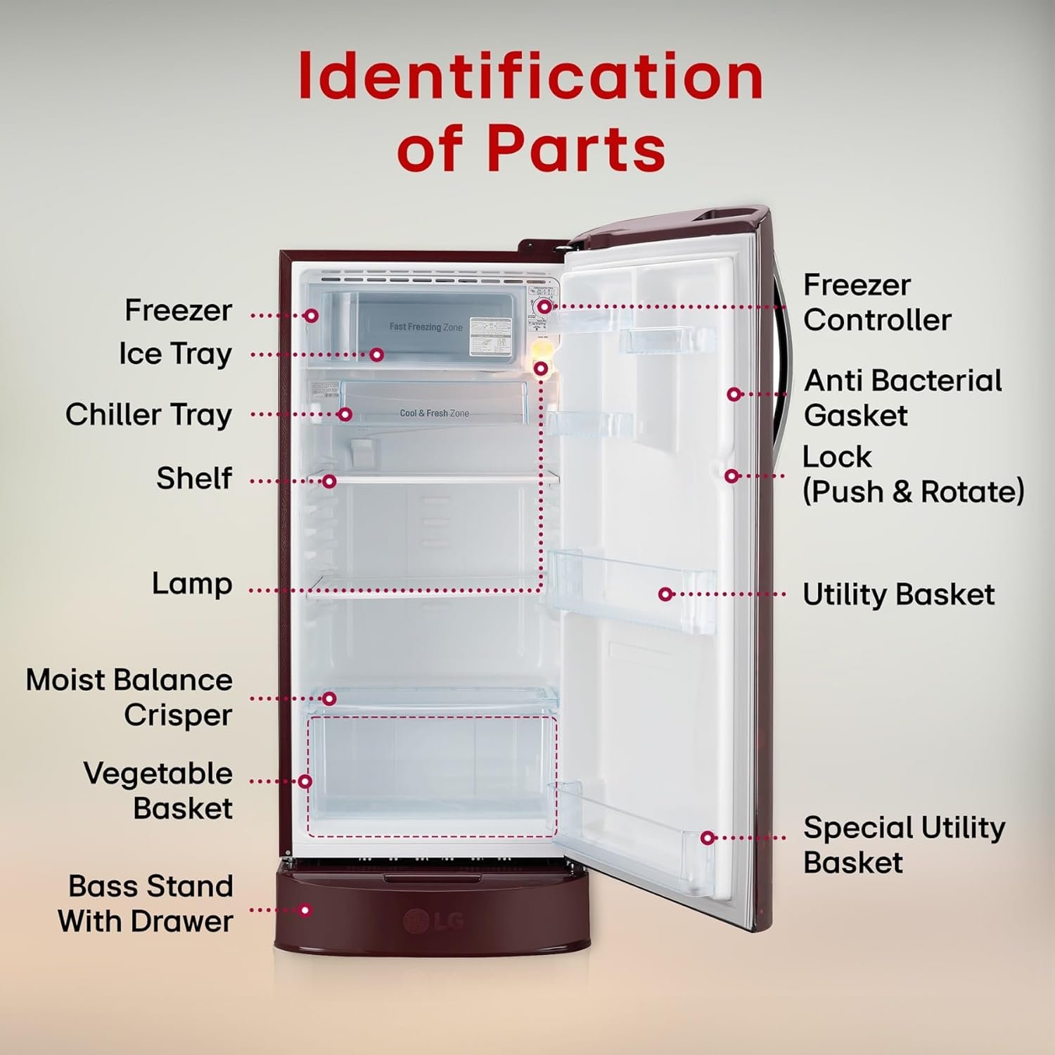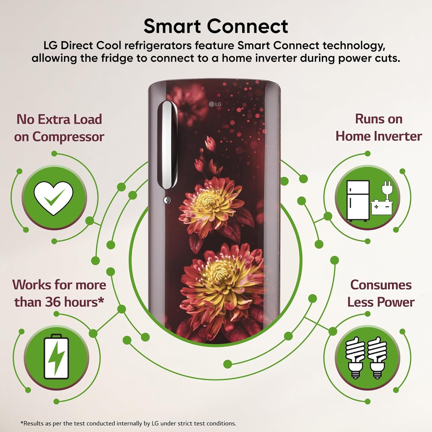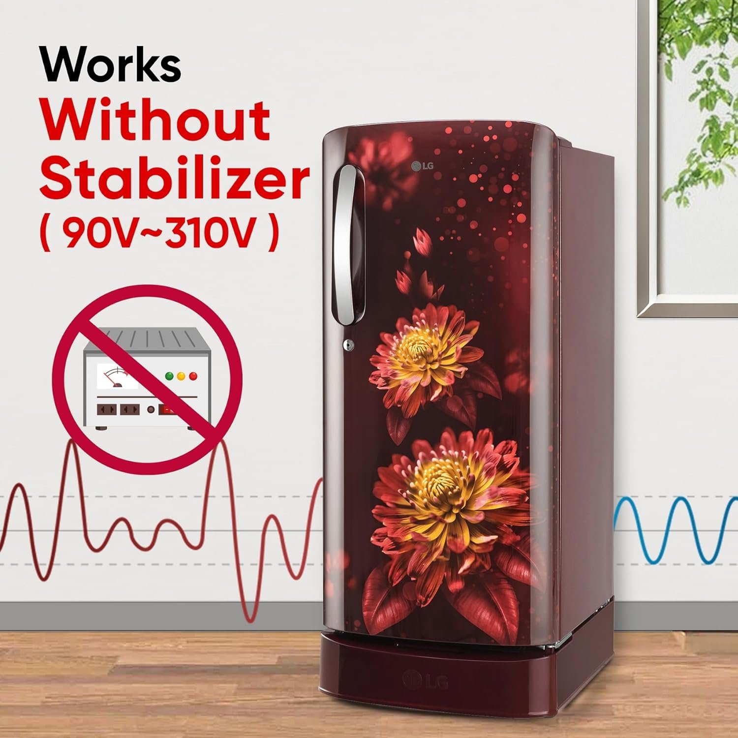 LG 185 L, 5 Star, Direct-Cool, Smart Inverter Compressor, Single Door Refrigerator with Fast Ice Making (GL-D201ASFU, Scarlet Florance, Runs on Home Inverter, Moist ‘N’ Fresh & Base stand with drawer)