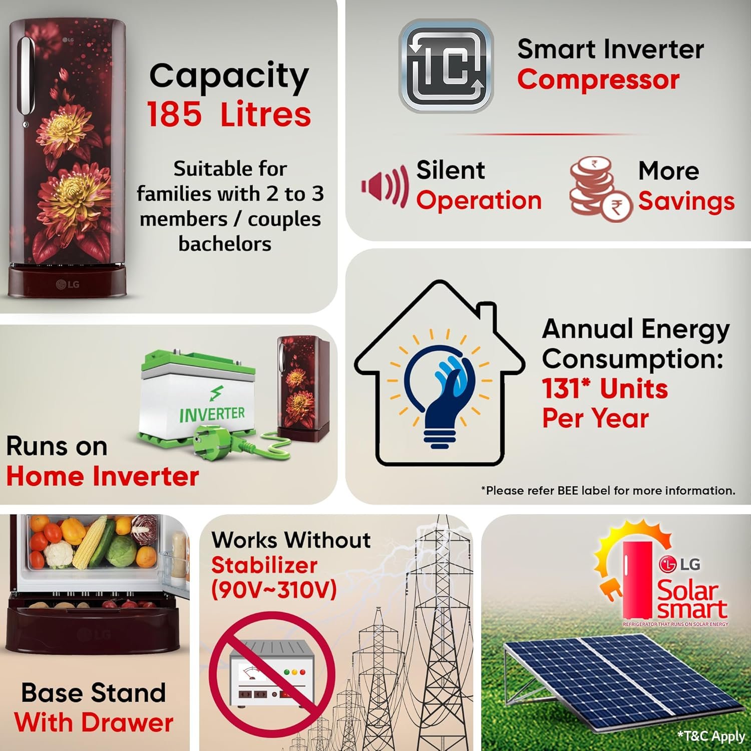 Key Features: Knob Control; Works Without Stabilizer (90 V ~ 310 V); Moist ‘N’ Fresh – maintain optimal moisture levels in the vegetable box, preventing fruits and vegetables from drying out and keeping them fresh for longer; Lock – Child Safety, enhancing safety and security; Anti-rat bite (Sleeve); Smart Connect; Solar Connect