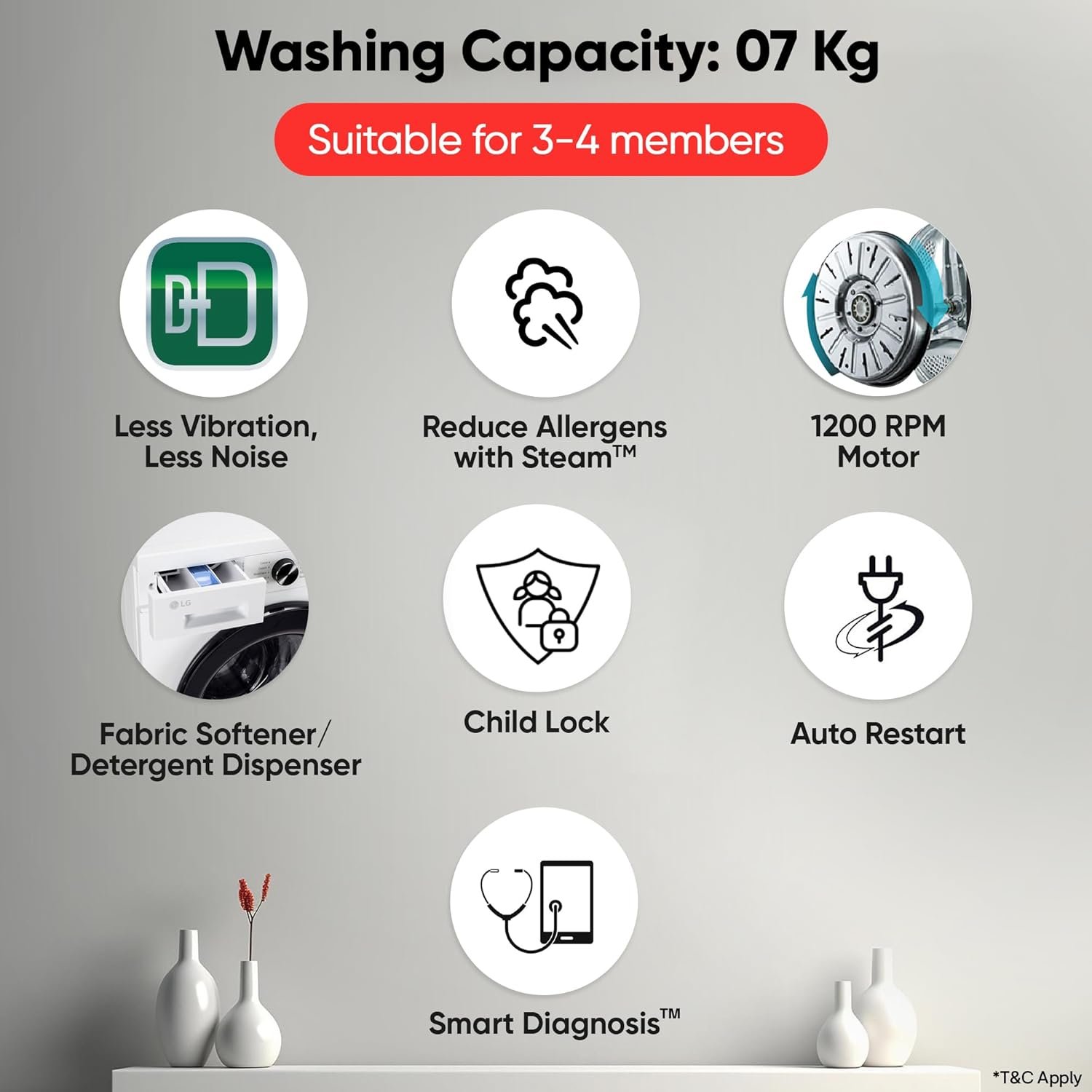 Capacity 7 kg: Suitable for 3 – 4 members | The maximum load per cycle depends on the washing program