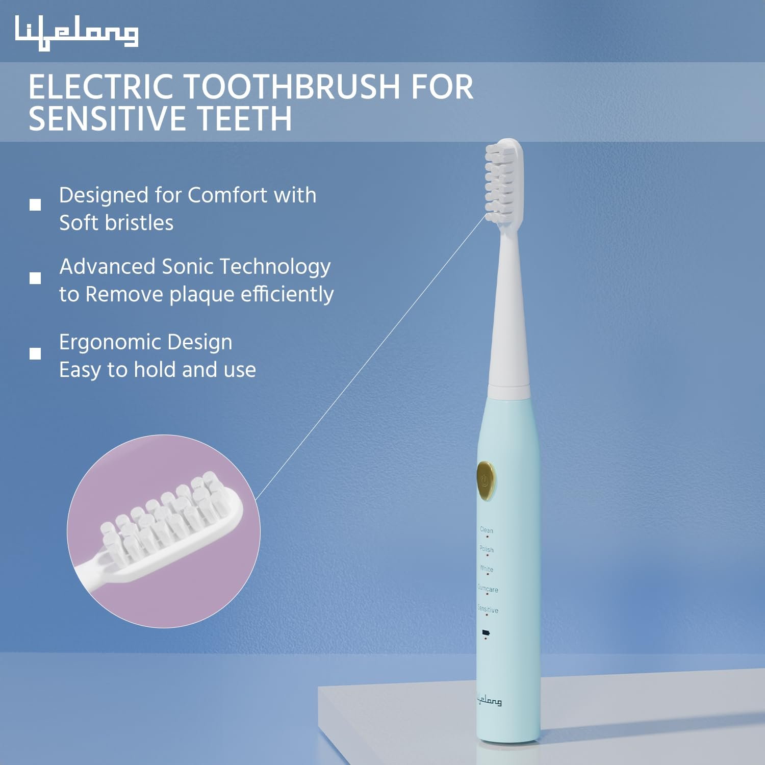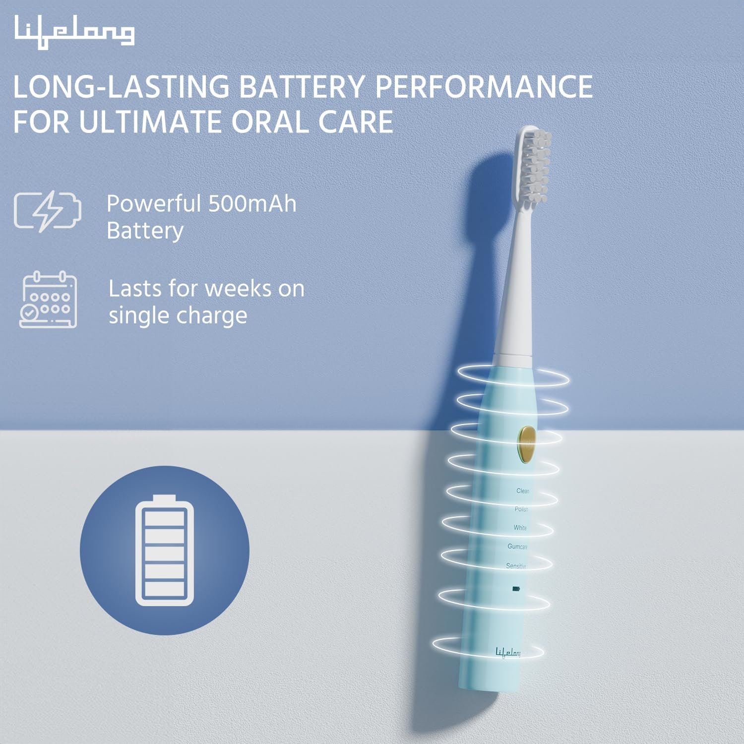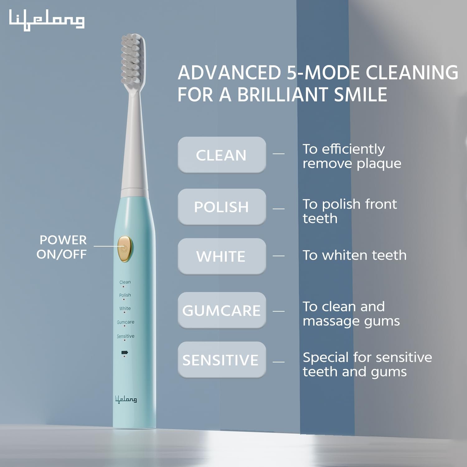 Lifelong Rechargeable Toothbrush for Adults – Smart Brush with 5 Cleaning Modes & Smart Auto Shut-Off – Electronic Toothbrush with 2 Electric Heads,500mAh Long-Lasting Battery (Blue,LLDC144)