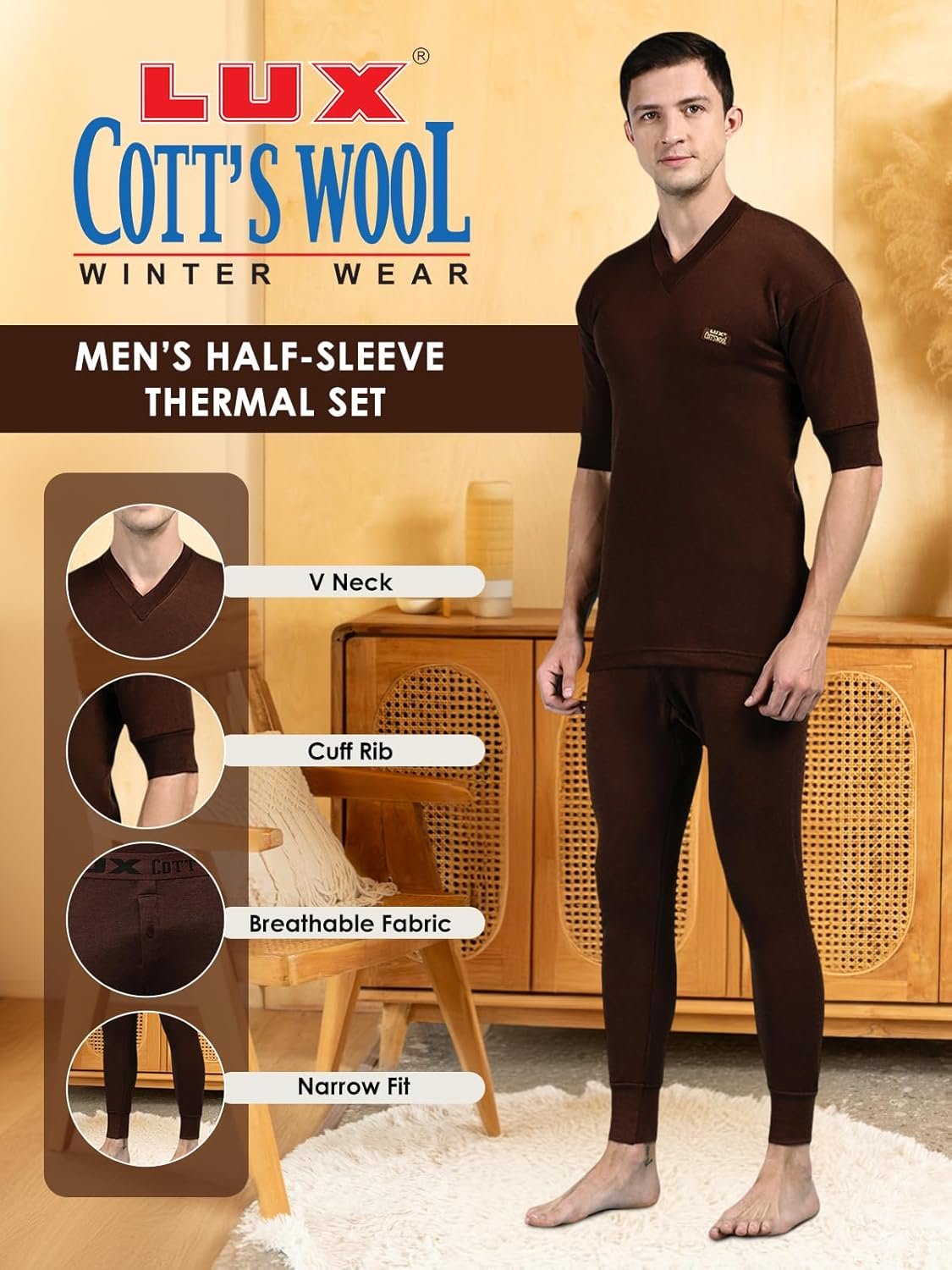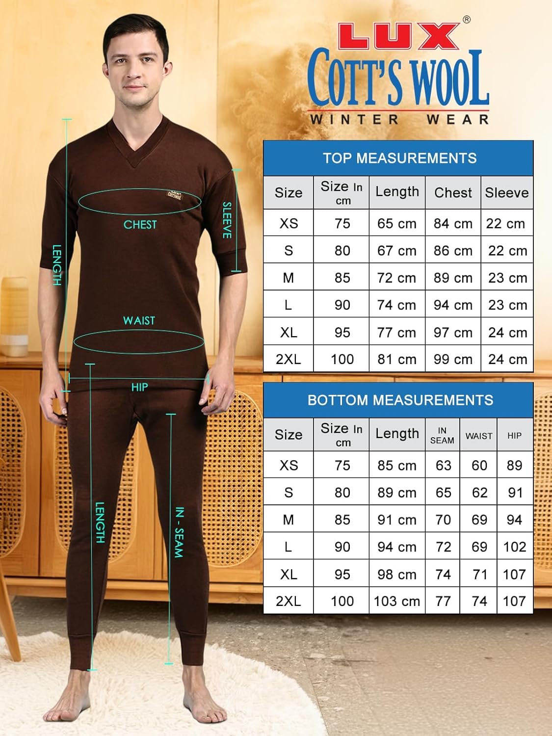 Lux Cott’sWool V neck Half Sleeves Thermal Set. A body-hugging thermal wear for icy days and chili nights Made from exceptional soft cotton, processed to draw moisture away Designed to be worn as underpants Available in Front open bottom for extra comfort. XS=75cm, S=80cm, M=85cm, L=90cm, XL=95cm, XXL=100cm,