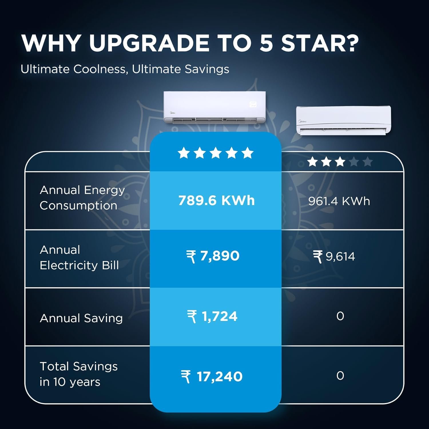 【Efficient Cooling】5 Star Energy Rating is best in class efficiency, Annual Energy Consumption (as per energy label) is 789.6 units(ISEER Value: 5.13), Midea ac 1.5 Ton 5 Star Cooling Capacity with 5230-5760 Watts, suitable for Mid sized rooms (111 sq ft to 150 sq. ft); 3D Cooling Air Directional control and Long 715 CFM Air Flow