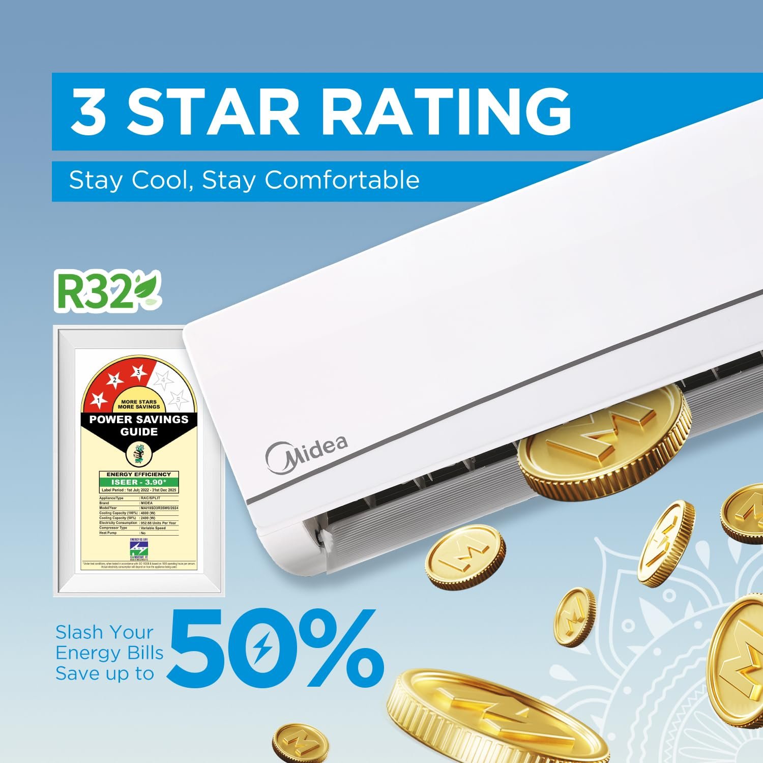 Energy Rating: 3 Star – Best in class efficiency | Annual Energy Consumption (as per energy label): 685.62 units, ISEER Value: 3.9 (please refer energy Label on product page or contact brand for more details)