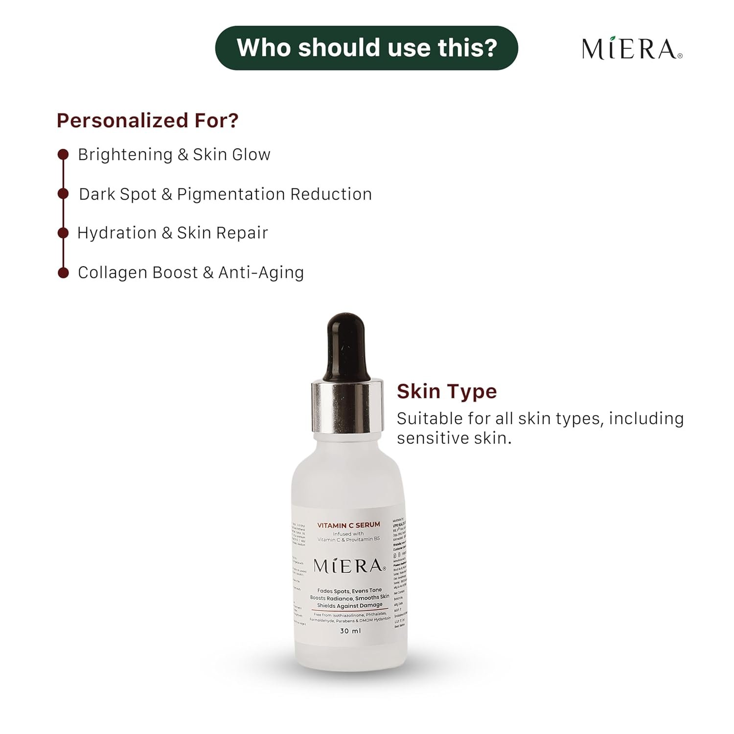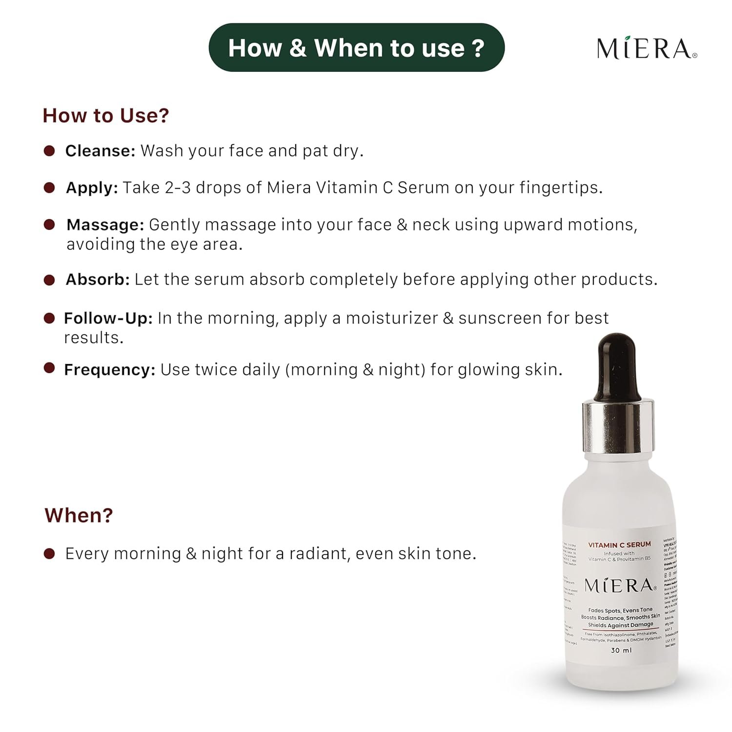 Miera Vitamin C Serum is your go-to solution for brighter, smoother, and more youthful skin, powered by the transformative benefits of Vitamin C and Aloe Vera. This advanced serum effectively brightens your complexion, fades dark spots, and reduces pigmentation to reveal an even skin tone. Vitamin C is a proven skincare hero, known for its ability to boost collagen production, improve elasticity, and reduce the appearance of fine lines and wrinkles, leaving your skin firmer and more radiant. Complementing this is Aloe Vera, a natural wonder with deep hydrating and soothing properties. Aloe Vera calms irritation, replenishes moisture, and strengthens the skin’s barrier, ensuring your skin feels soft, smooth, and rejuvenated. Together, these two ingredients create a powerful formula that combats dullness, dryness, and signs of aging while promoting a healthy, glowing complexion. The serum’s lightweight, non-greasy texture absorbs quickly into your skin, making it ideal for all skin types, including sensitive skin. Packed with antioxidants from Vitamin C, this serum also protects your skin from environmental stressors like pollution and UV rays, helping to prevent premature aging and damage. Free from harsh chemicals such as parabens, phthalates, and formaldehyde, Miera Vitamin C Serum is safe and gentle for daily use. To achieve optimal results, start with a cleansed face, apply 2–3 drops of serum to your fingertips, and gently massage it into your face and neck using upward motions. Allow it to fully absorb before applying other products. Use it twice daily, in the morning and at night, and follow with sunscreen during the day to protect your skin and maximize the brightening and protective effects of Vitamin C. With regular use, you’ll notice visibly brighter, smoother, and more youthful skin. Transform your skincare routine with Miera Vitamin C Serum, a dynamic blend of Vitamin C and Aloe Vera designed to give you radiant, healthy skin every day.