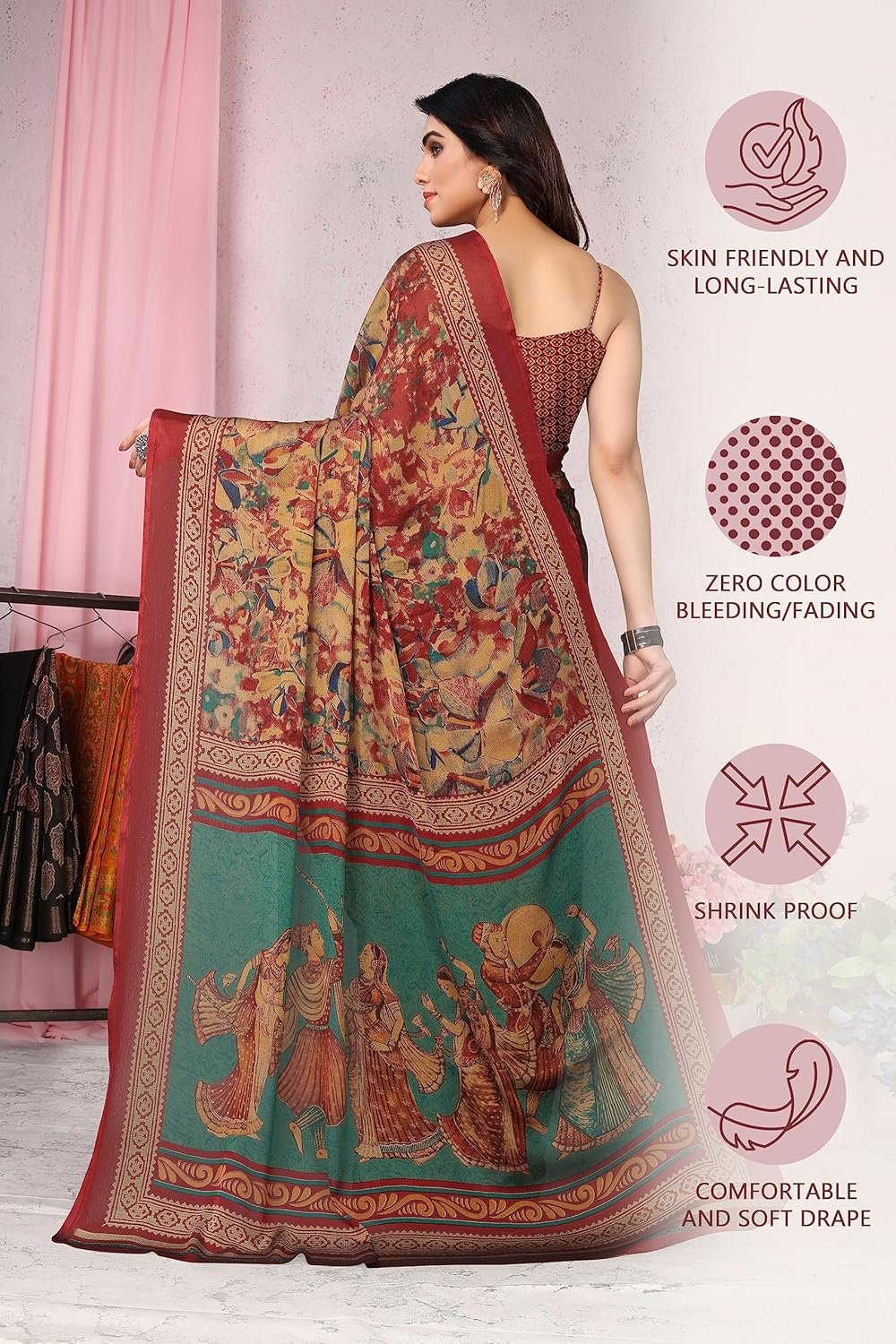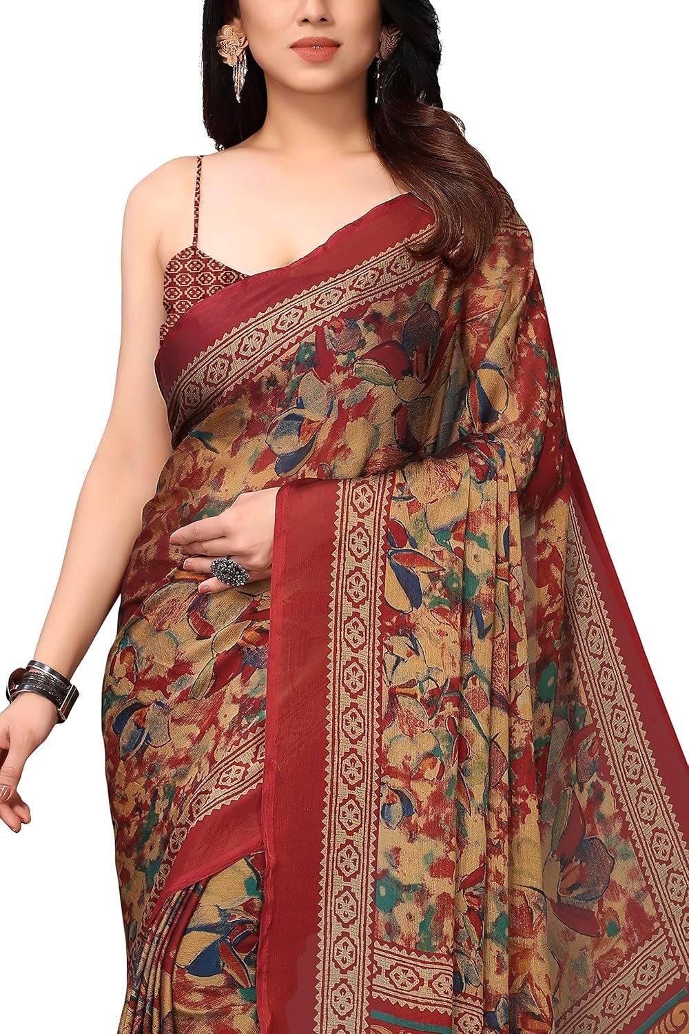 This sari comes with matching Chiffon printed blouse fabric, which can be stitched according to your comfort Up to 32 to 42 Inches.