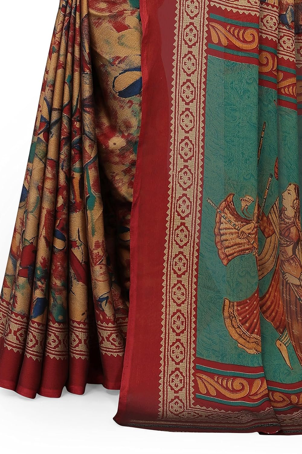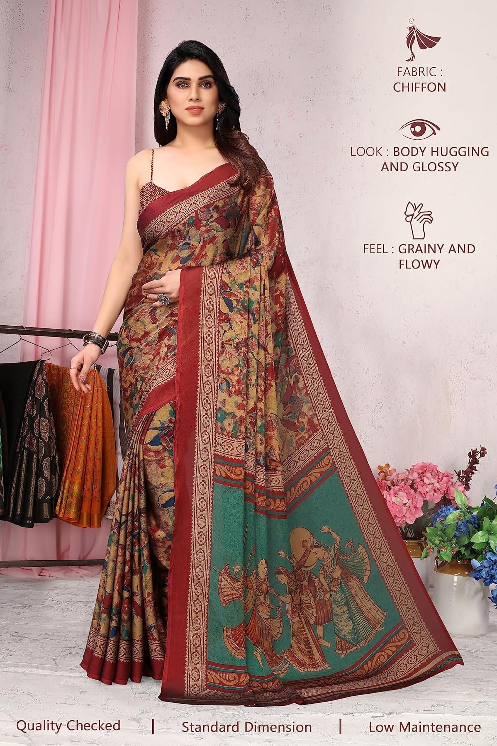 Beautifully designed Indian Traditional ethnic regular wear sarees made of high-quality fabric Chiffon having beautiful ethnic motifs and tribal printed design with human figure printed pallu design. Mirchi Fashion brings you a nice addition to the wardrobe of every fashionable female, who wants to look glamorous and distinct.