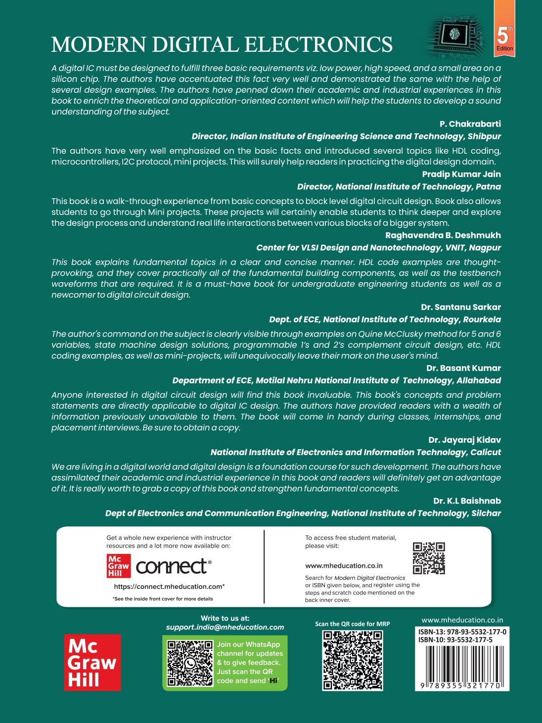 The fifth edition of Modern Digital Electronics is thoroughly mapped with that latest AICTE model syllabus. Its primary focus is on rigorous coverage of design and analysis of complex digital circuits, and systems through enhanced elucidation of Sequential Logic Design, PLDs, Memories, Verilog as well as VHDL implementation codes with test bench and waveforms. Beginning with the fundamental concepts of digital electronics, it covers digital design using VHDL and Verilog supported by plethora of examples.