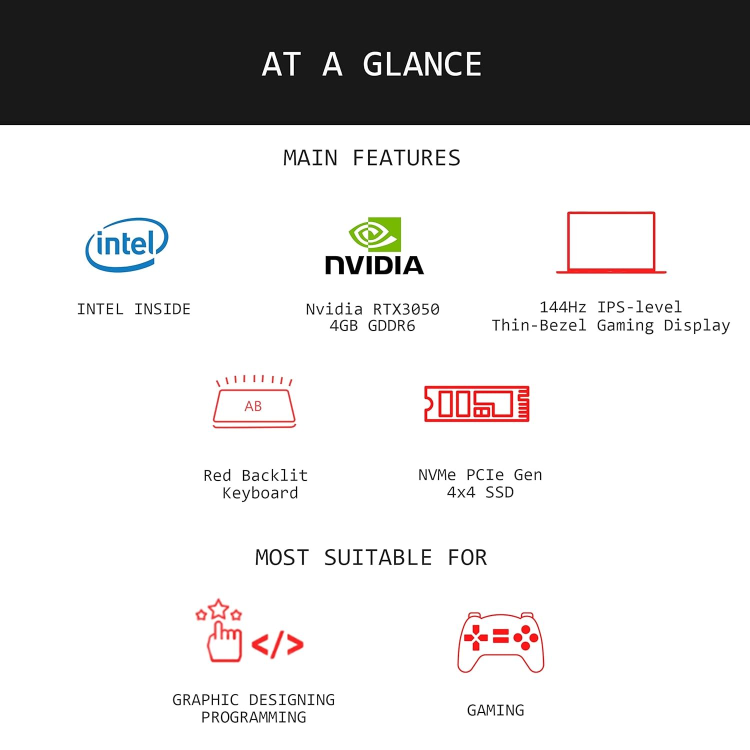 Dedicated Graphics: NVIDIA GeForce RTX 3050 GDDR6 4GB;”Thin and light design | Laptop weight: 2.25 kg “; Keyboard: Backlight Keyboard (Single-Color, Red);Camera:HD type (30fps@720p) | Microphone: Built-in microphone