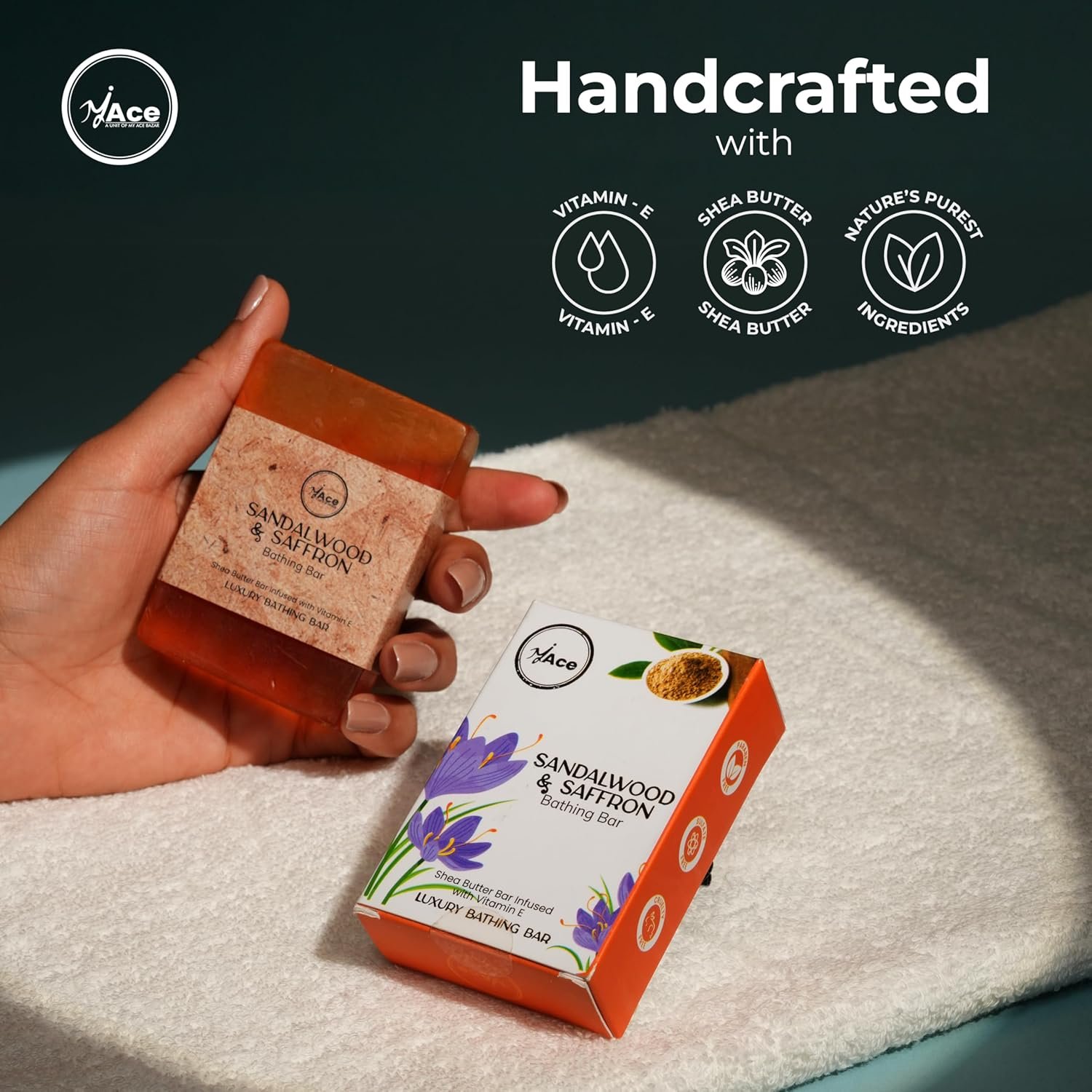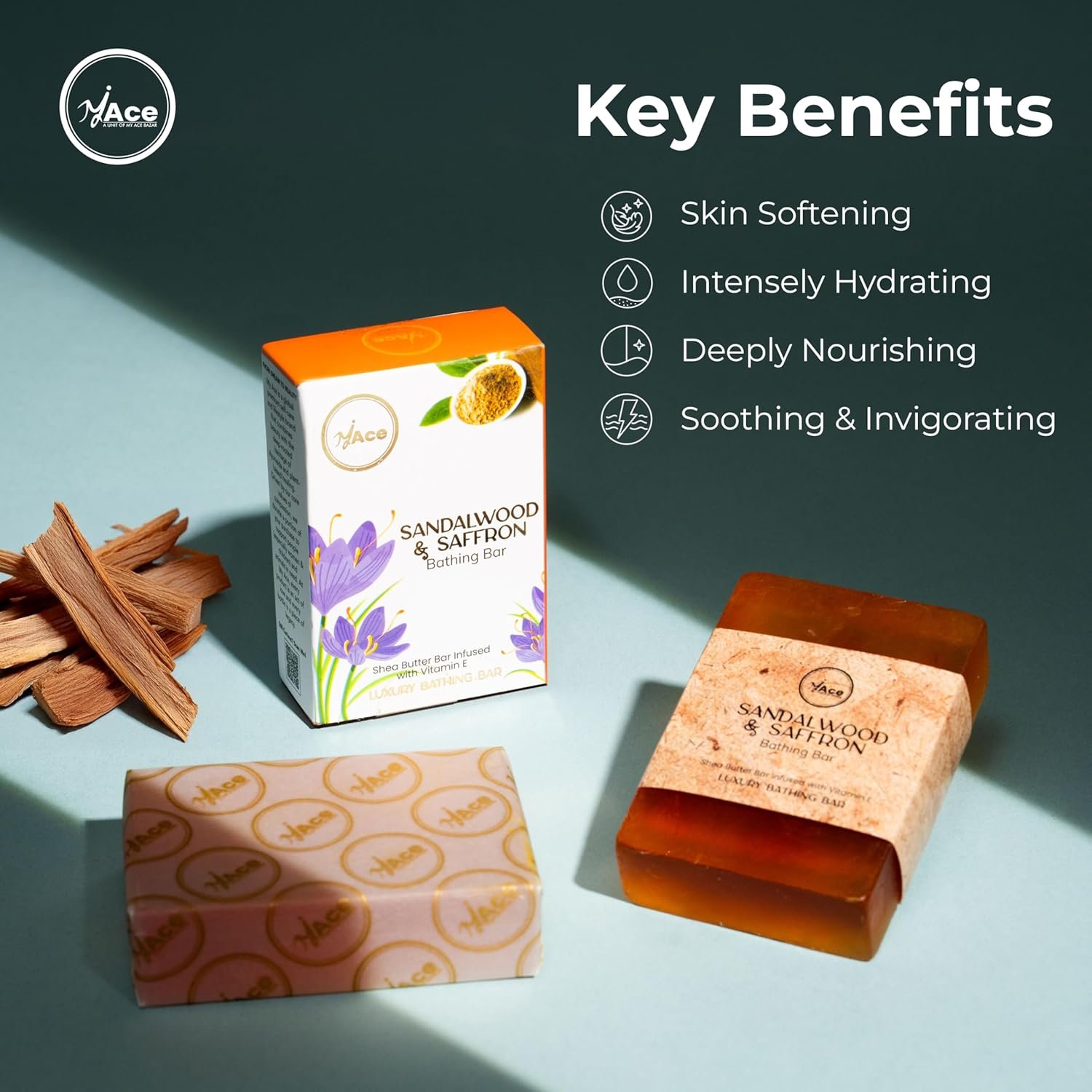My Ace Sandalwood & Saffron Brightening Bathing Bar – Handmade Soap with Natural Extracts & Coconut Oil, Shea Butter & Vitamin E, SLES-Free, Skin Glow Care (100g Each, Pack of 3)