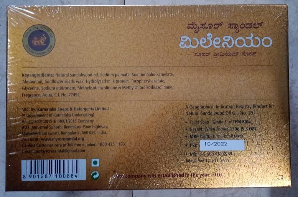 Mysore Sandal Soap is a brand of soap manufactured by the Karnataka Soaps and Detergents Limited (KSDL), a company owned by the government of Karnataka in India. This soap has been manufactured since 1916, when Krishna Raja Wadiyar IV, the king of Mysore, set up the Government Soap Factory in Bangalore
