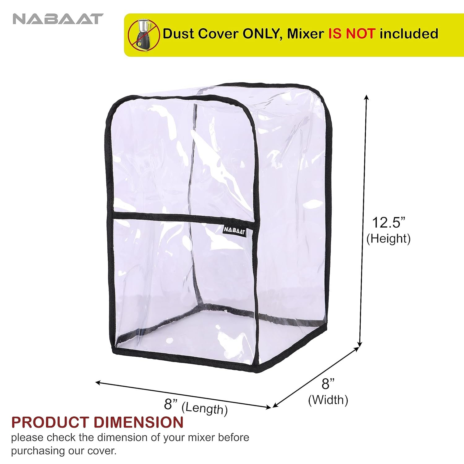 TRANSPARENT THICK MATERIAL: Nabaat Mixer grinder cover is made from transparent high-quality, heavy-duty waterproof material for long-lasting durability and keep the machine from erosion by the vapor.WIDE APPLICATION SIZE: Measuring 8(L) x 8(W) x 12.5(H) inches, this standard fit most standard Mixer Grinders or also can be keep on some food processors appliances. (COVER ONLY)PROTECT YOUR MIXER GRINDER: Nabaat mixer grinder cover keeps your beloved mixer under wraps while being protected from various kitchen elements including dust, dirt, stains, spills, fingerprints, scratches and more. It is padded to prevent the small appliance from tiny impacts. You can be assured that you will have the mixer look as good as new.