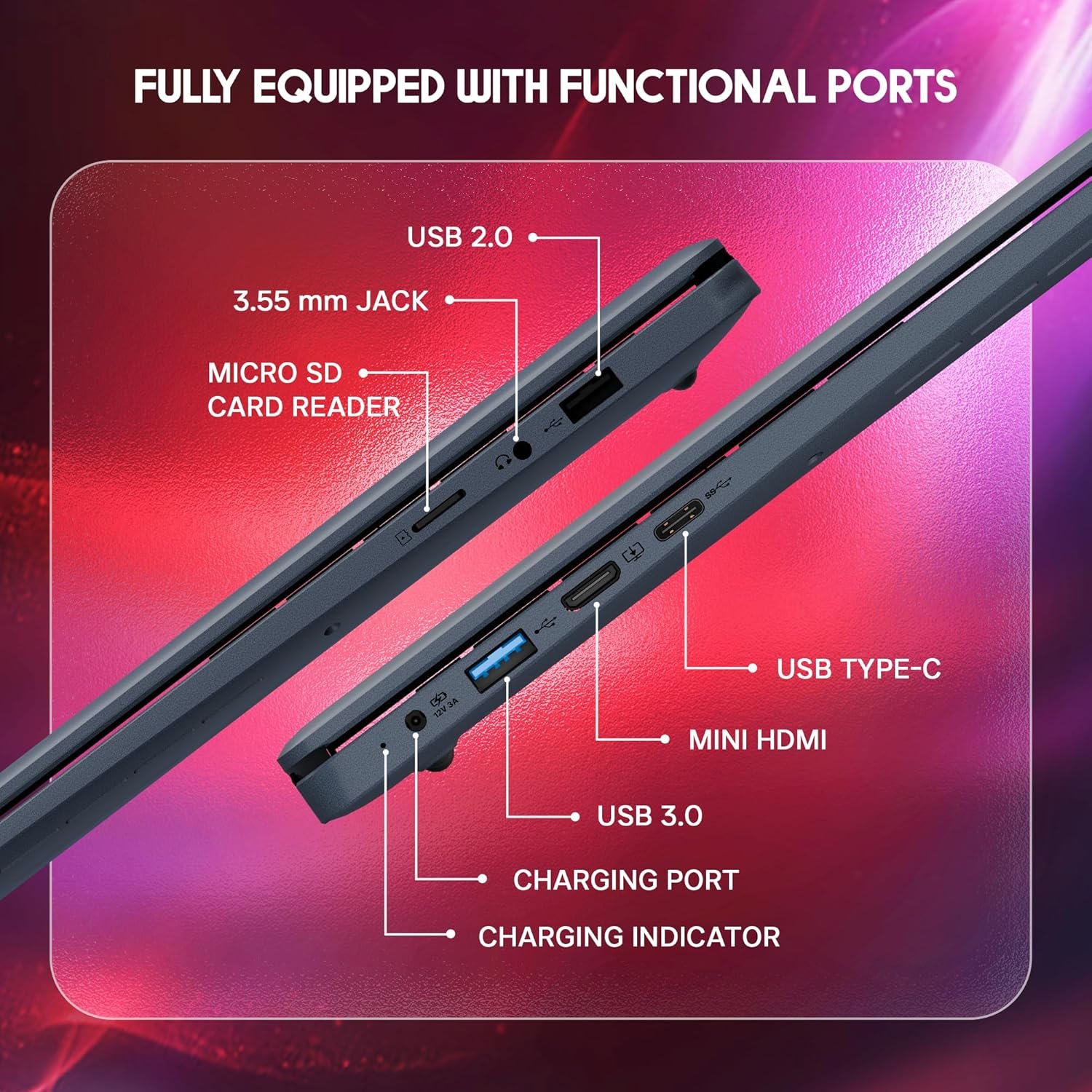 Multiple Ports: Equipped with USB 3.0, Type-C, Mini HDMI, a Micro SD card slot, and a 3.5mm audio jack, it offers versatile connectivity options for all your devices and accessories.