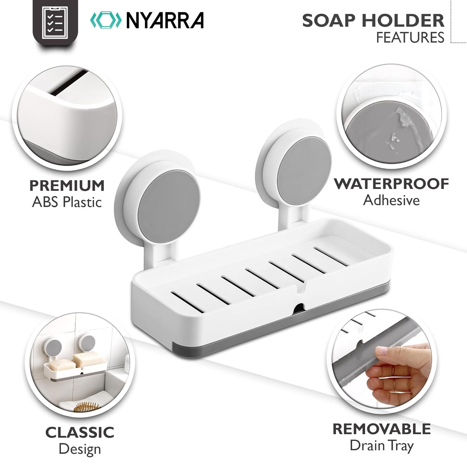 Nyarra Acrylonitrile_Butadiene_Styrene_ABS Soap Holder for Bathroom – Non-Drill Wall Mount Magic Sticker Self Adhesive Soap Stand for Bathroom with Removable Drain Tray – [NR-1335]
