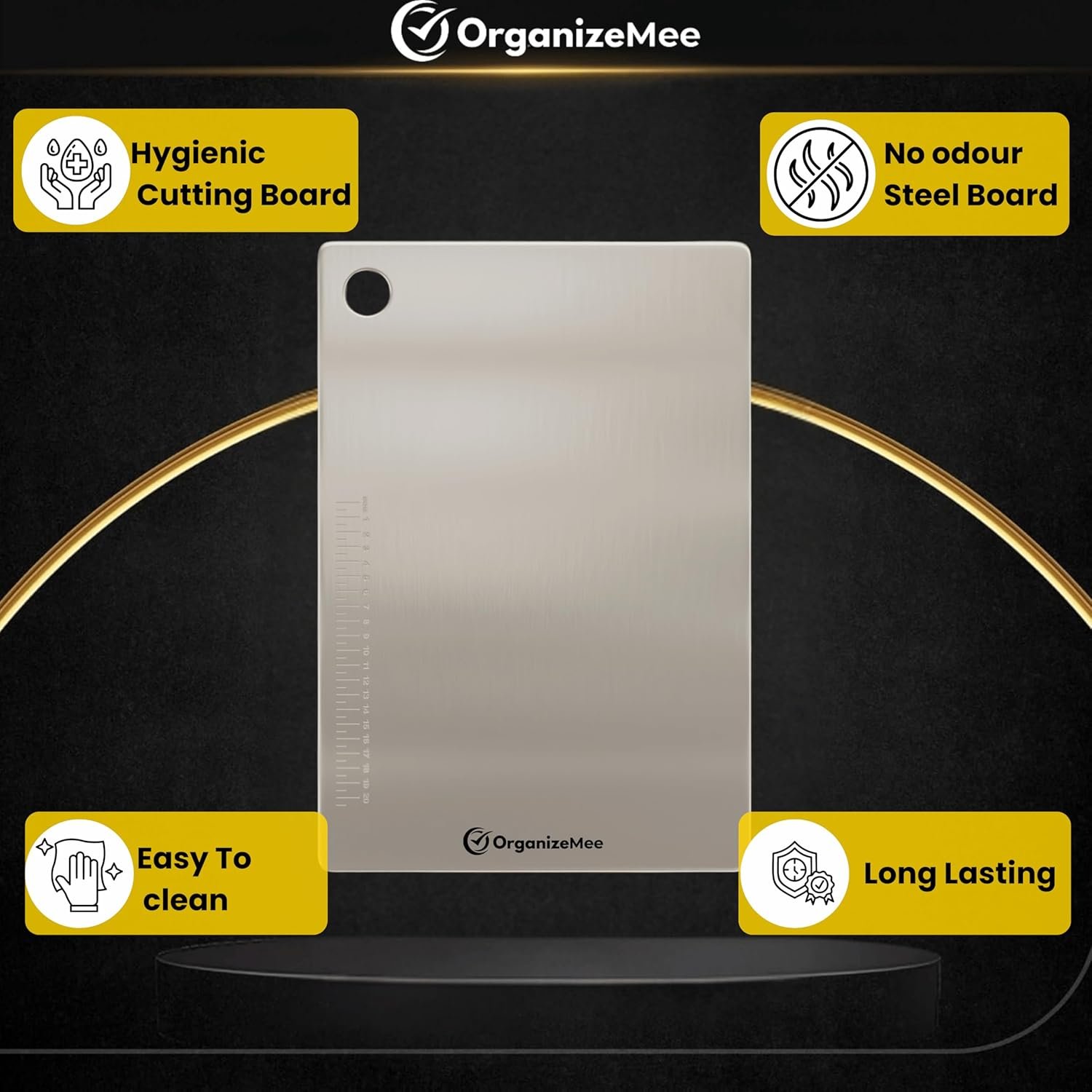 ELEVATE YOUR KITCHEN AESTHETICS: Introducing a modern touch to your kitchen, our sleek stainless steel cutting board from Organizemee not only offers functionality but also enhances the visual appeal of your cooking space. Transform your kitchen into a stylish haven for culinary creativity.