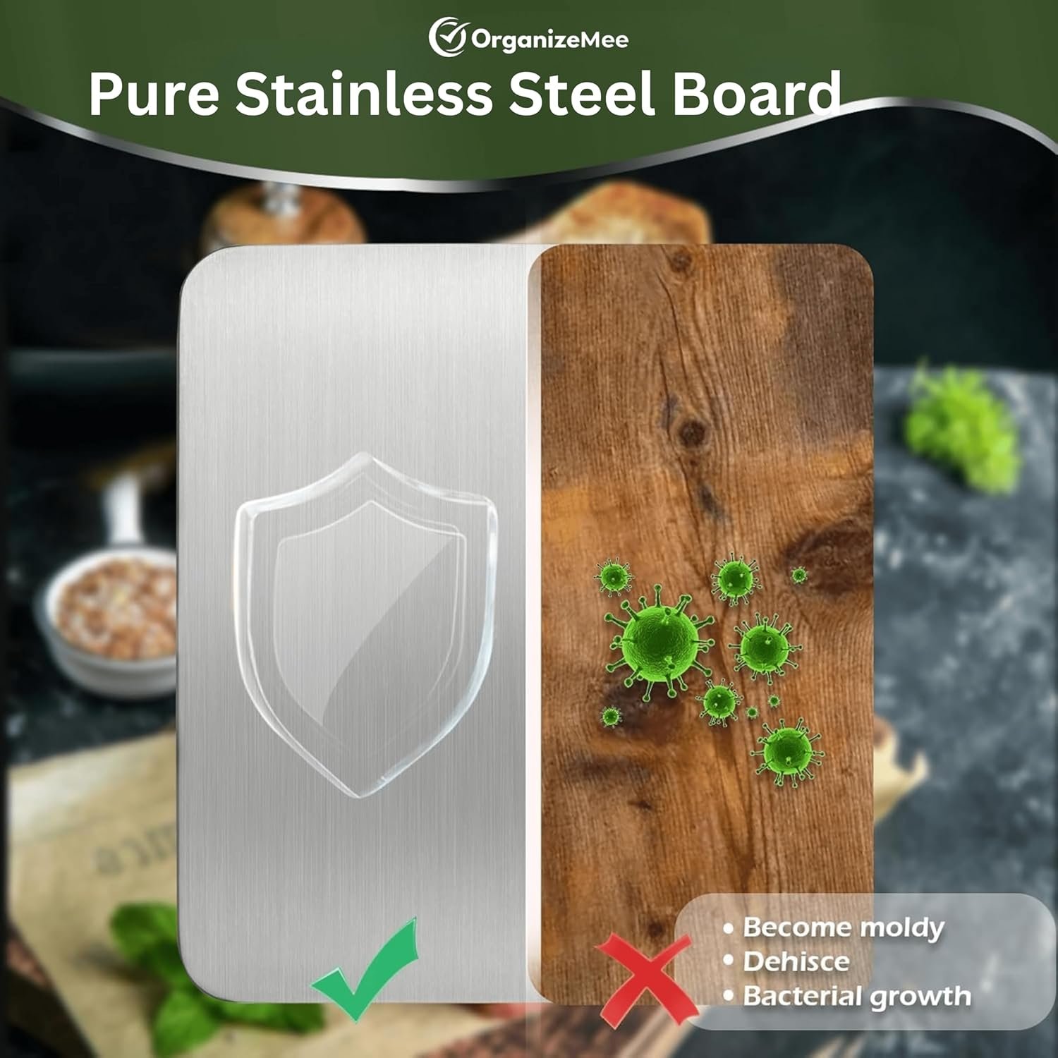 WORRIED ABOUT GERMS? Unhealthy plastic chips and wooden mouldy bacteria entering into food while chopping OrganizeMee stainless steel board is your new best friend! It repels yucky stuff like odors and stains, keeping your food fresh & safe Enjoy healthy chopping with peace of mind!