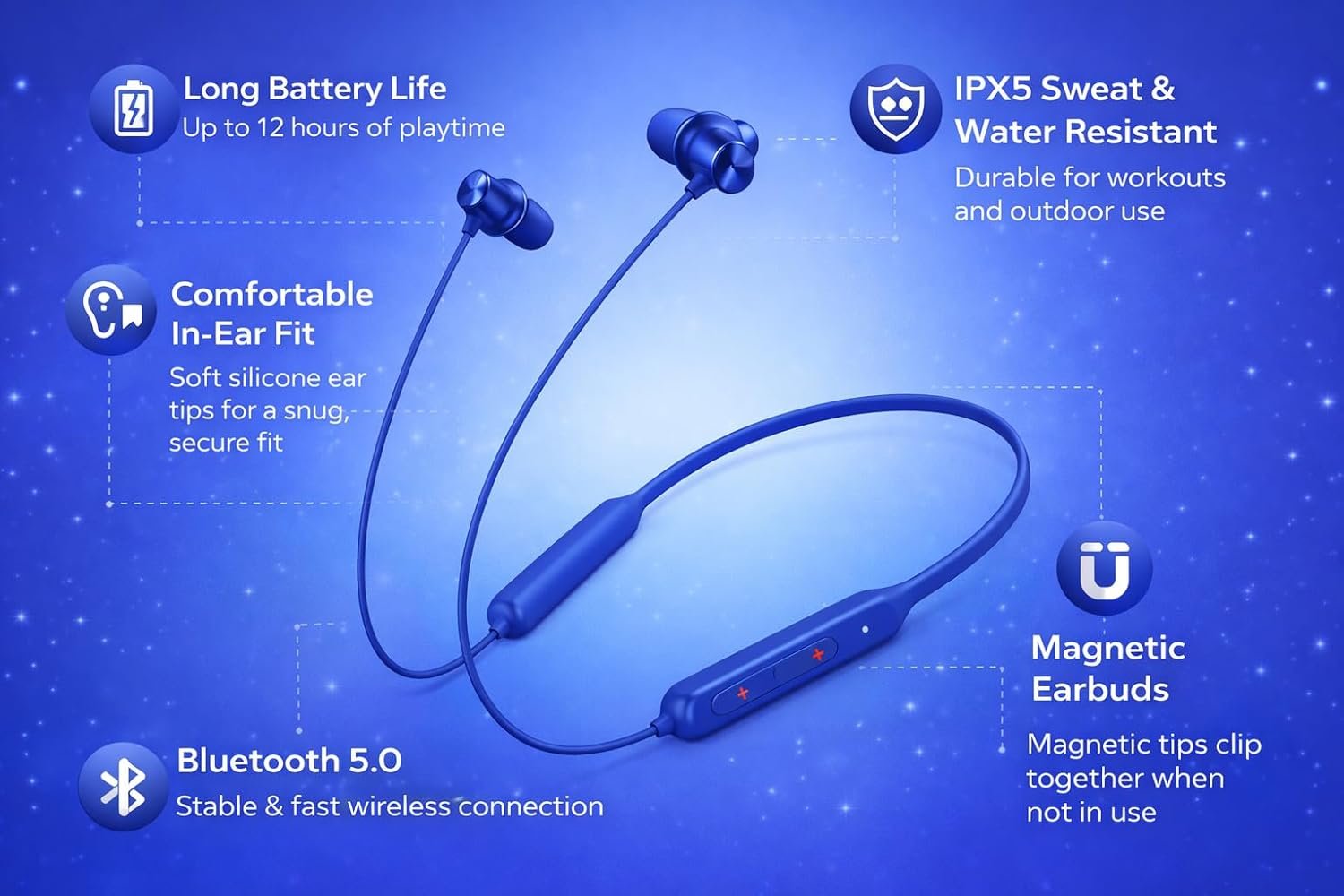 Experience seamless wireless audio with this advanced neckband earphone featuring smart magnetic auto-connect technology for effortless pairing and power control. Designed to deliver balanced sound output with clear vocals and deep bass, it enhances music, calls, and entertainment on the go. Active noise cancellation helps reduce background distractions for a more immersive listening experience. The lightweight, ergonomic neckband ensures all-day comfort, while the Type-C charging support enables faster and more convenient recharging. Ideal for work, travel, and workouts, this neckband combines smart functionality, comfort, and reliable performance in one sleek design.