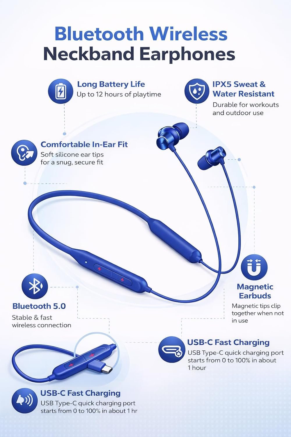 Experience seamless wireless audio with this advanced neckband earphone featuring smart magnetic auto-connect technology for effortless pairing and power control. Designed to deliver balanced sound output with clear vocals and deep bass, it enhances music, calls, and entertainment on the go. Active noise cancellation helps reduce background distractions for a more immersive listening experience. The lightweight, ergonomic neckband ensures all-day comfort, while the Type-C charging support enables faster and more convenient recharging. Ideal for work, travel, and workouts, this neckband combines smart functionality, comfort, and reliable performance in one sleek design.