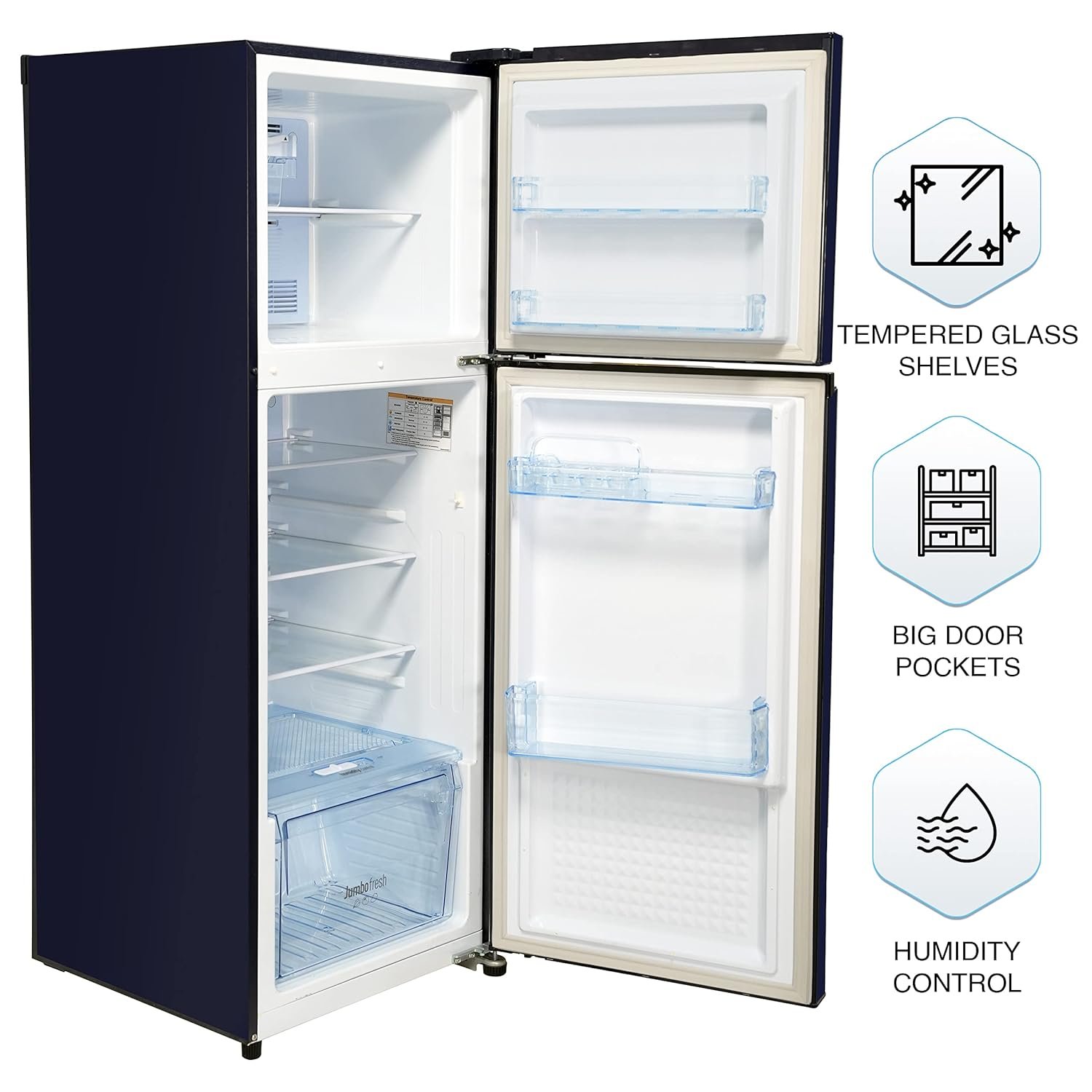 Tempered Glass Shelves: The highly durable tempered glass shelves can withstand weight upto 100 kgs; making it easy to store heavy pans and containers. Double Twist Ice Tray: The detachable double twist ice tray makes it easy to dispense and collect ice in the ice box below. }