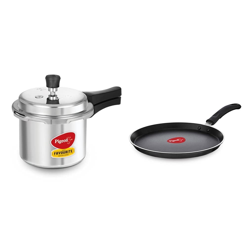 Pigeon By Stovekraft Favourite Induction Base Aluminium Pressure Cooker with Outer Lid, 3 Litres (Silver) & Pigeon by Stovekraft Special Non-Stick Aluminium Flat Tawa, Black (27cm)