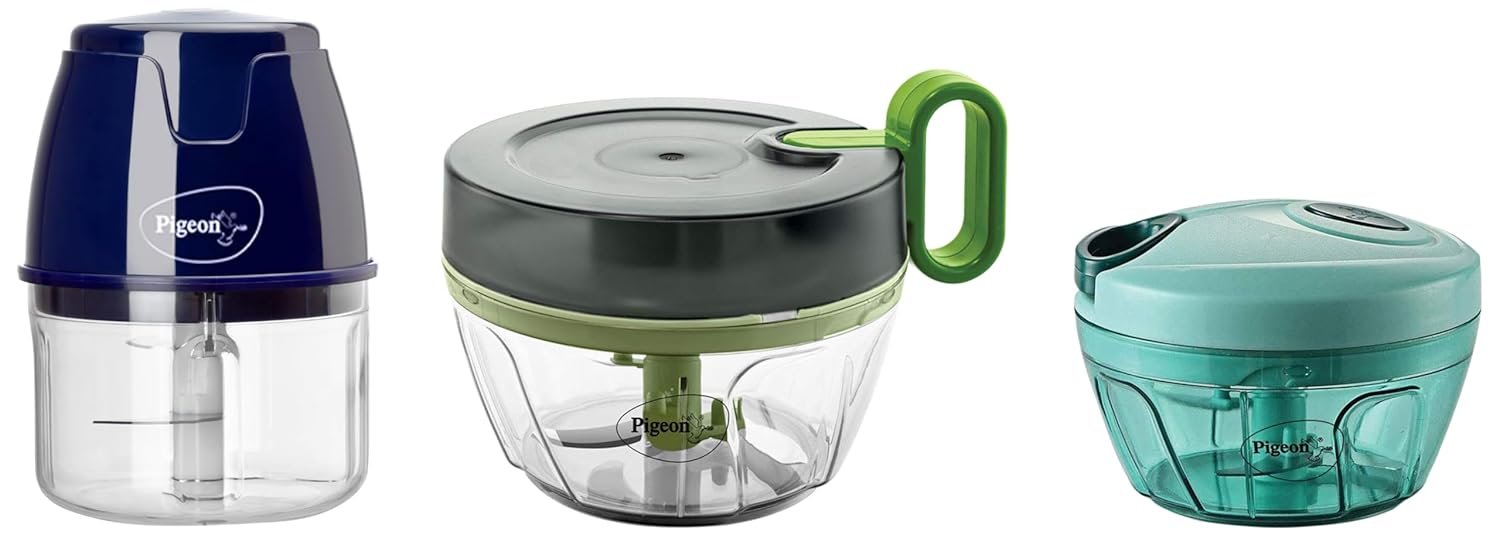 Pigeon Zoom Electric Chopper (250 ml, Blue) & Polypropylene Mini Handy (Green, 400 ml) & Plastic Mini Handy Pro and Compact Chopper with 3 Blades (400 ml, Grey)