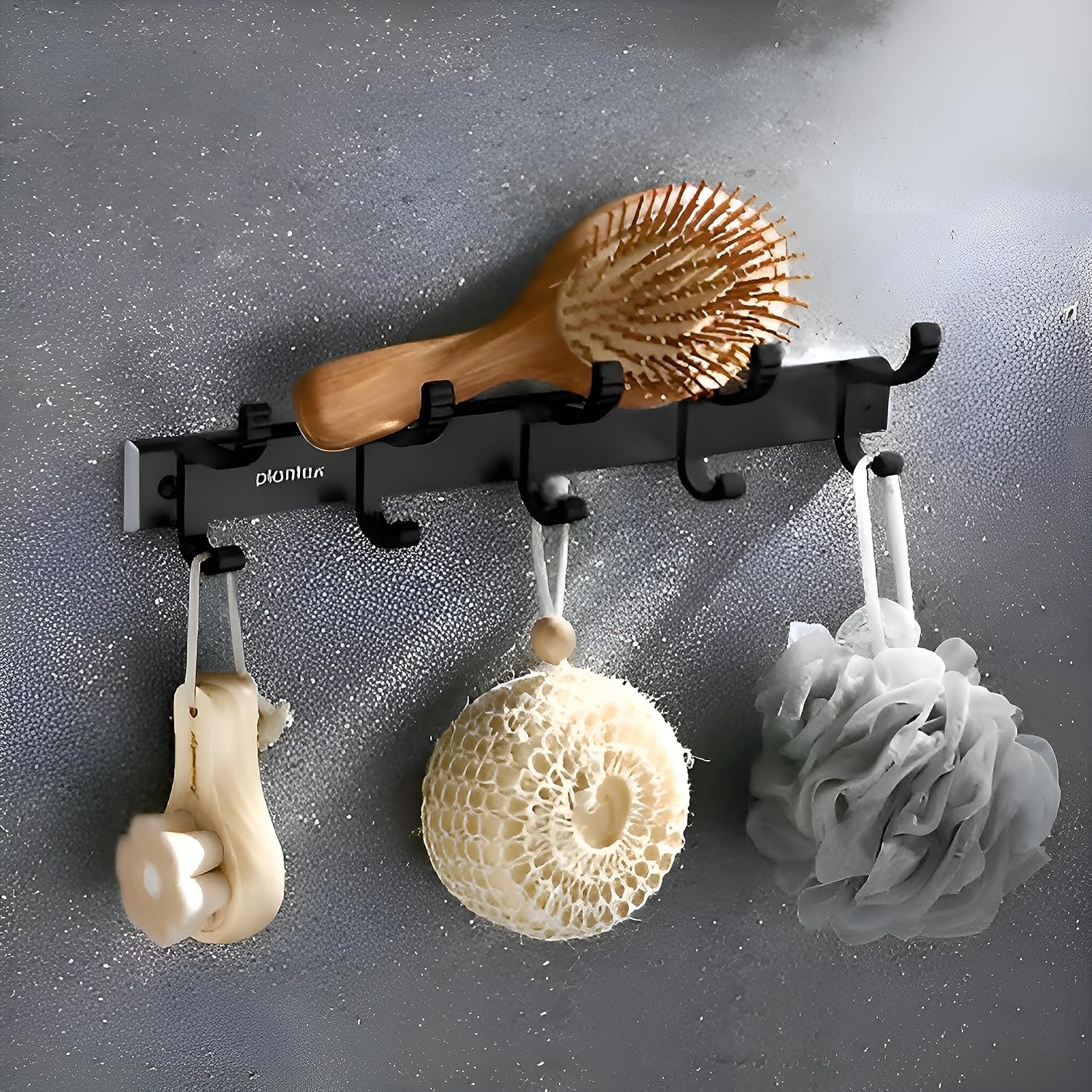 Plantex aluminum hook rail for home comes with 5 anti-rusting and sliding hooks to hang your keys, brushes, id-cards, towels, clothes, and robes according to your needs.