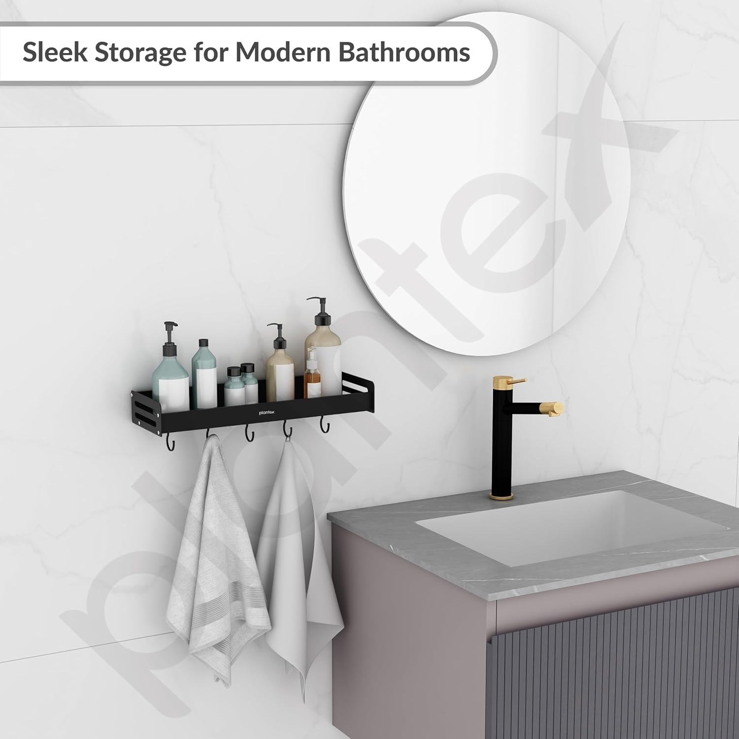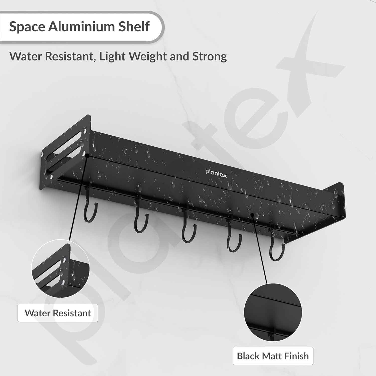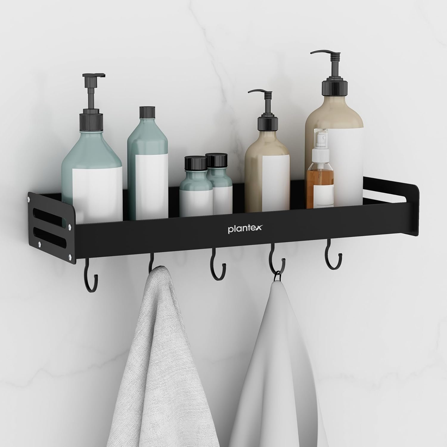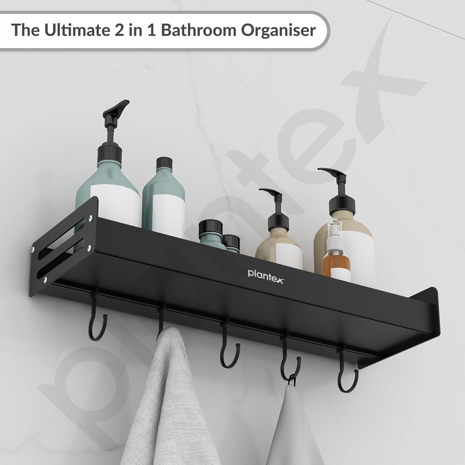 Plantex Multipurpose Aluminium Bathroom Wall Shelf/Bathroom Shelf Rack with Movable Hooks/Bathroom Accessories Set/Shelf for Bathrooms/Kitchen Organiser -(Black)