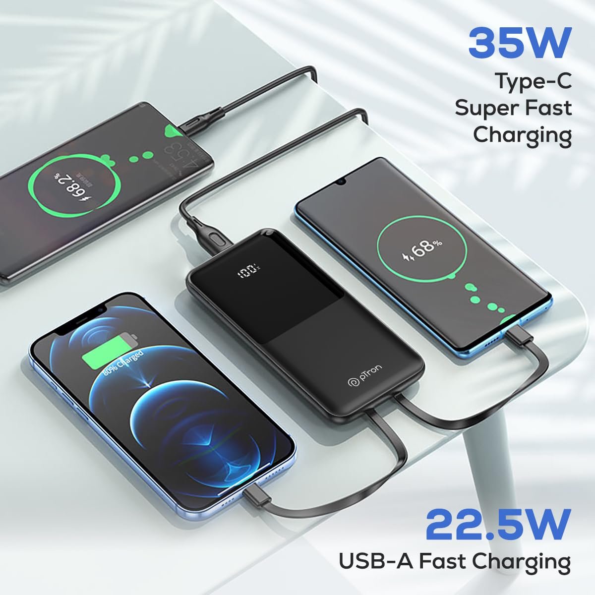 35W Super Fast Charging: Dynamo Bolt Power bank supports 35W Wired Charging thru Type-C/PD Port & Type-C Cable || Built-in Cables to Charge your Device at 22.5W Fast Charging via USB-A Port