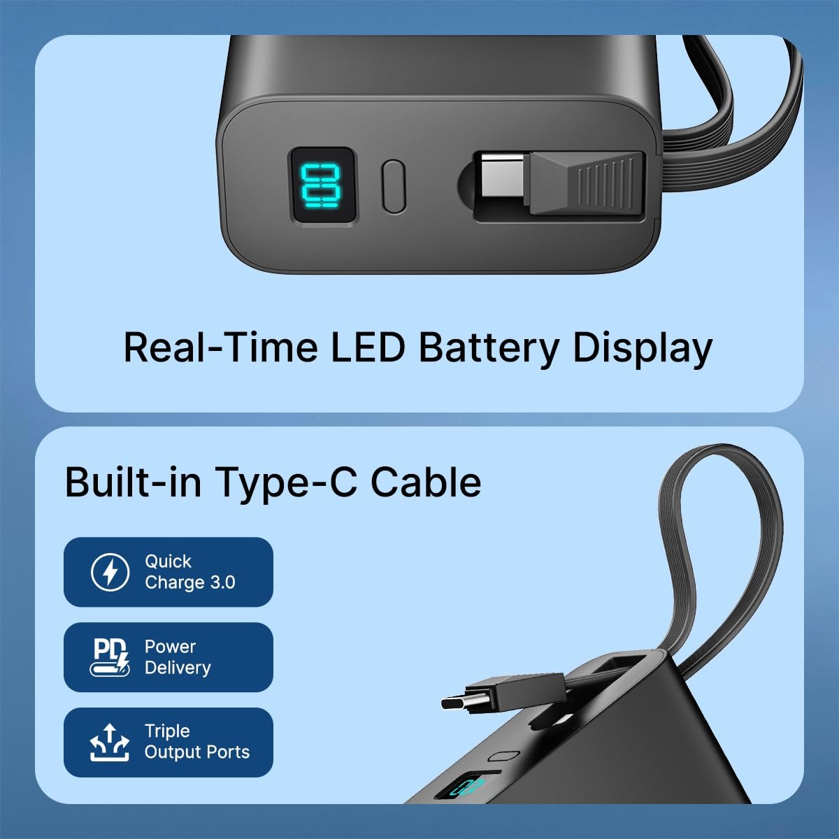 PD (Power delivery), Quick Charge (QC) & PPS Charging Compatible | Output Ports – USB A x 1 & Type-C x 1 | Type-C Port Supports Input & Output both | Built-in Type-C Charging Output Cable